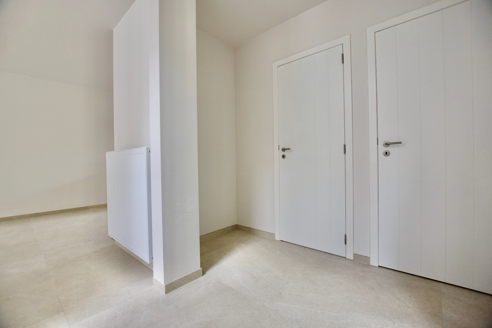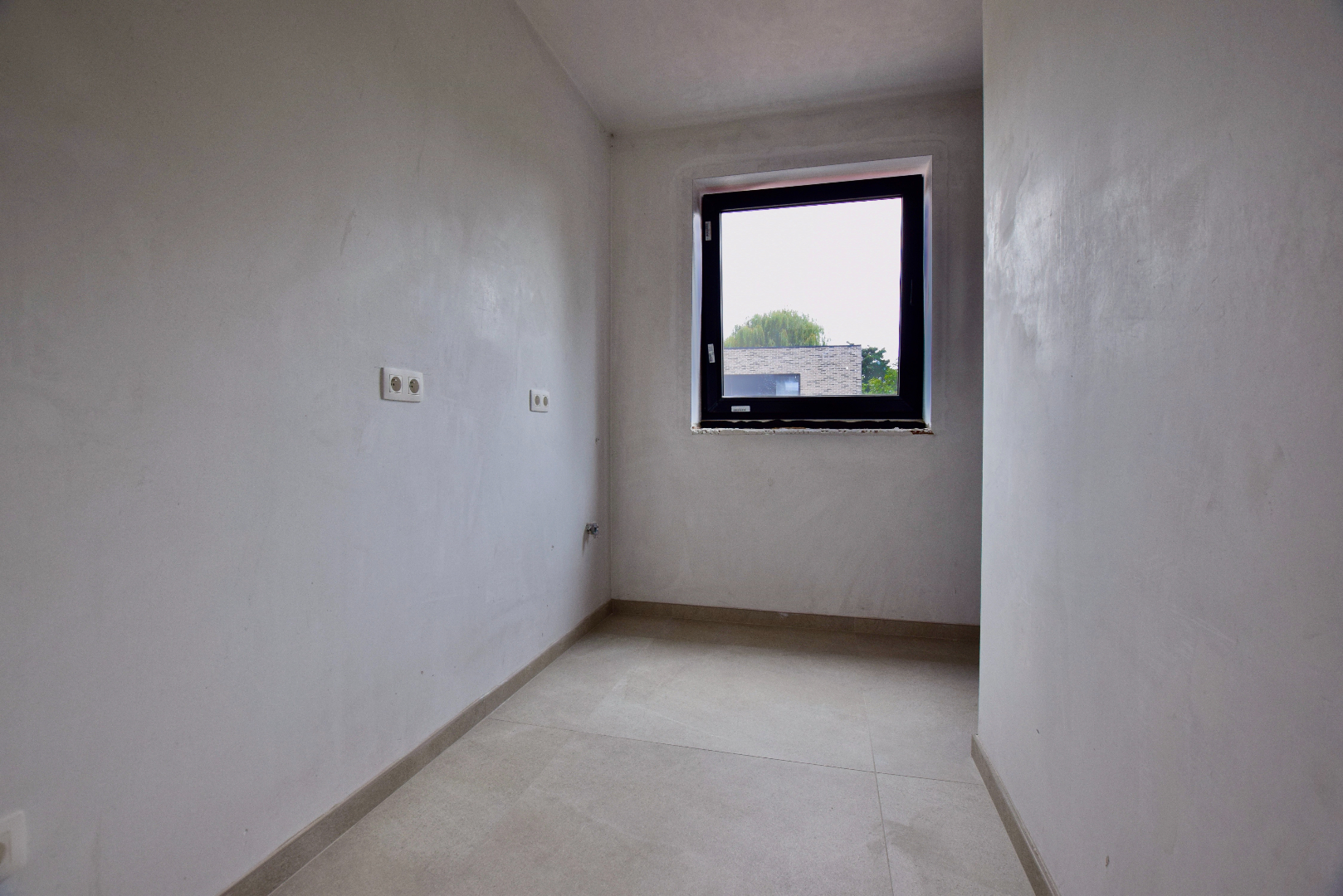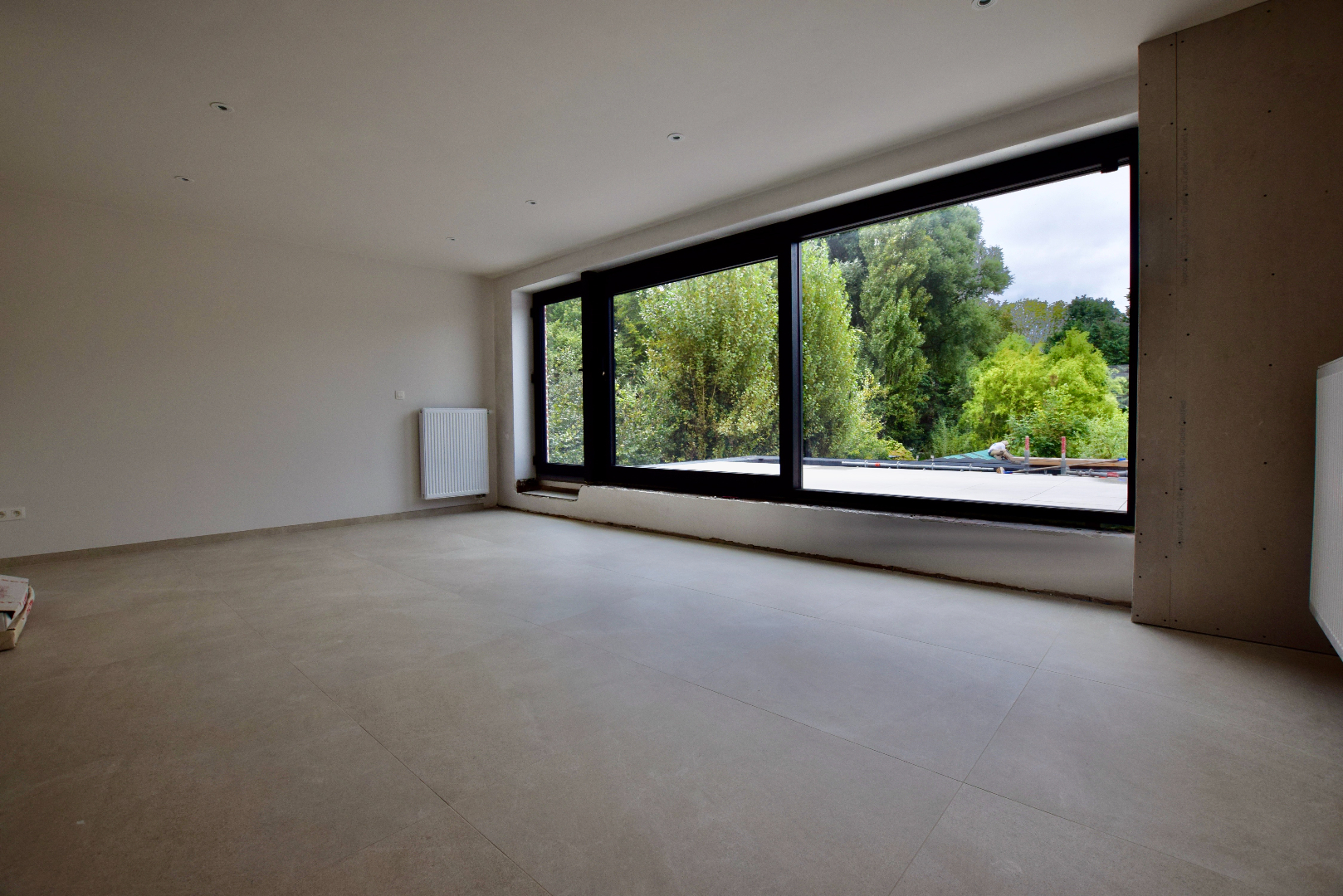 Eerste verdieping: op dit verdiep bevindt zich een zeer ruime en lichtrijke woonkamer met aansluiten een open keuken voorzien van alle nodige toestellen en comfort waaronder een koelkast, een diepvriezer, een oven, een inductie kookvuur, een dampkap en een vaatwasser. Vanuit de woonkamer hebt u toegang tot het ruime terras (dat nog afgesloten zal worden d.m.v. een omheining) waar u kan genieten van een groen en open uitzicht en alle rust. Verder is er een berging voorzien van aansluitingen voor een wasmachine en een droogkast en een gastentoilet met een handenwasser.