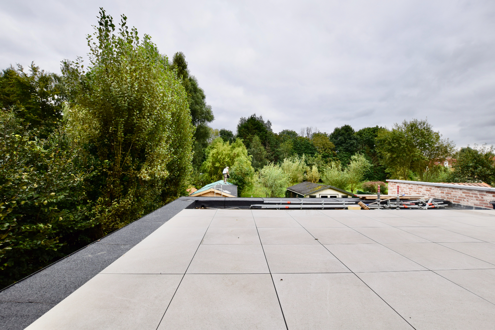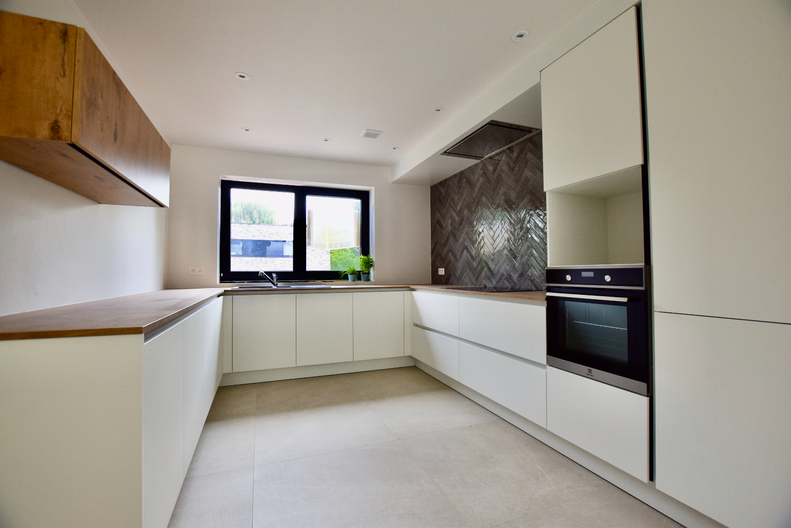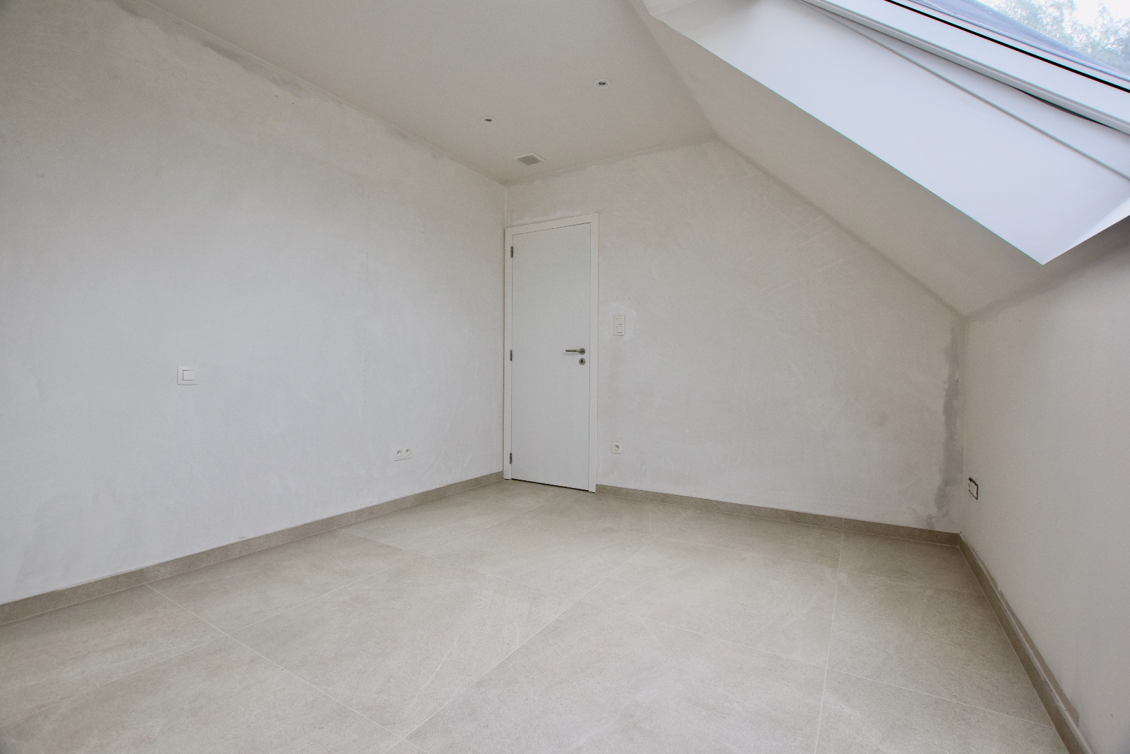 Eerste verdieping: op dit verdiep bevindt zich een zeer ruime en lichtrijke woonkamer met aansluiten een open keuken voorzien van alle nodige toestellen en comfort waaronder een koelkast, een diepvriezer, een oven, een inductie kookvuur, een dampkap en een vaatwasser. Vanuit de woonkamer hebt u toegang tot het ruime terras (dat nog afgesloten zal worden d.m.v. een omheining) waar u kan genieten van een groen en open uitzicht en alle rust. Verder is er een berging voorzien van aansluitingen voor een wasmachine en een droogkast en een gastentoilet met een handenwasser.