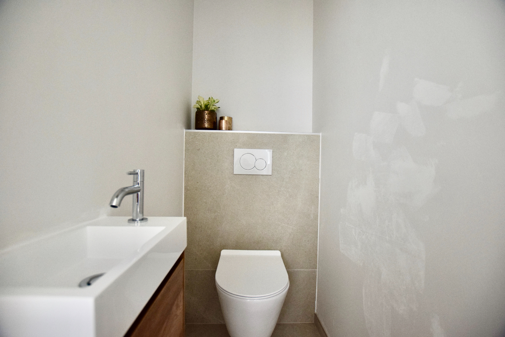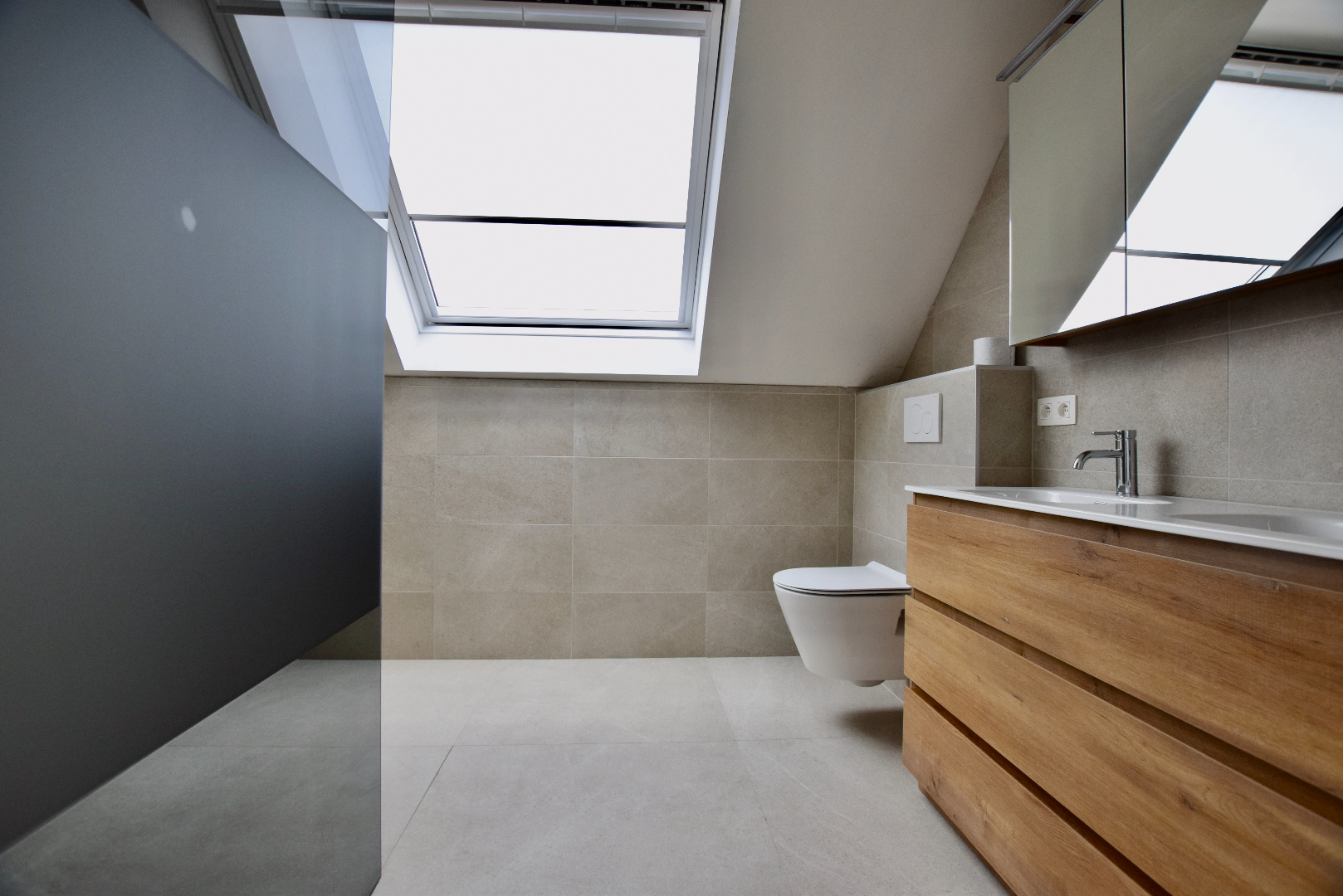 Tweede verdieping: hier vindt u de twee slaapkamers en een badkamer voorzien van een inloopdouche, een toilet en een wastafel in een meubel.