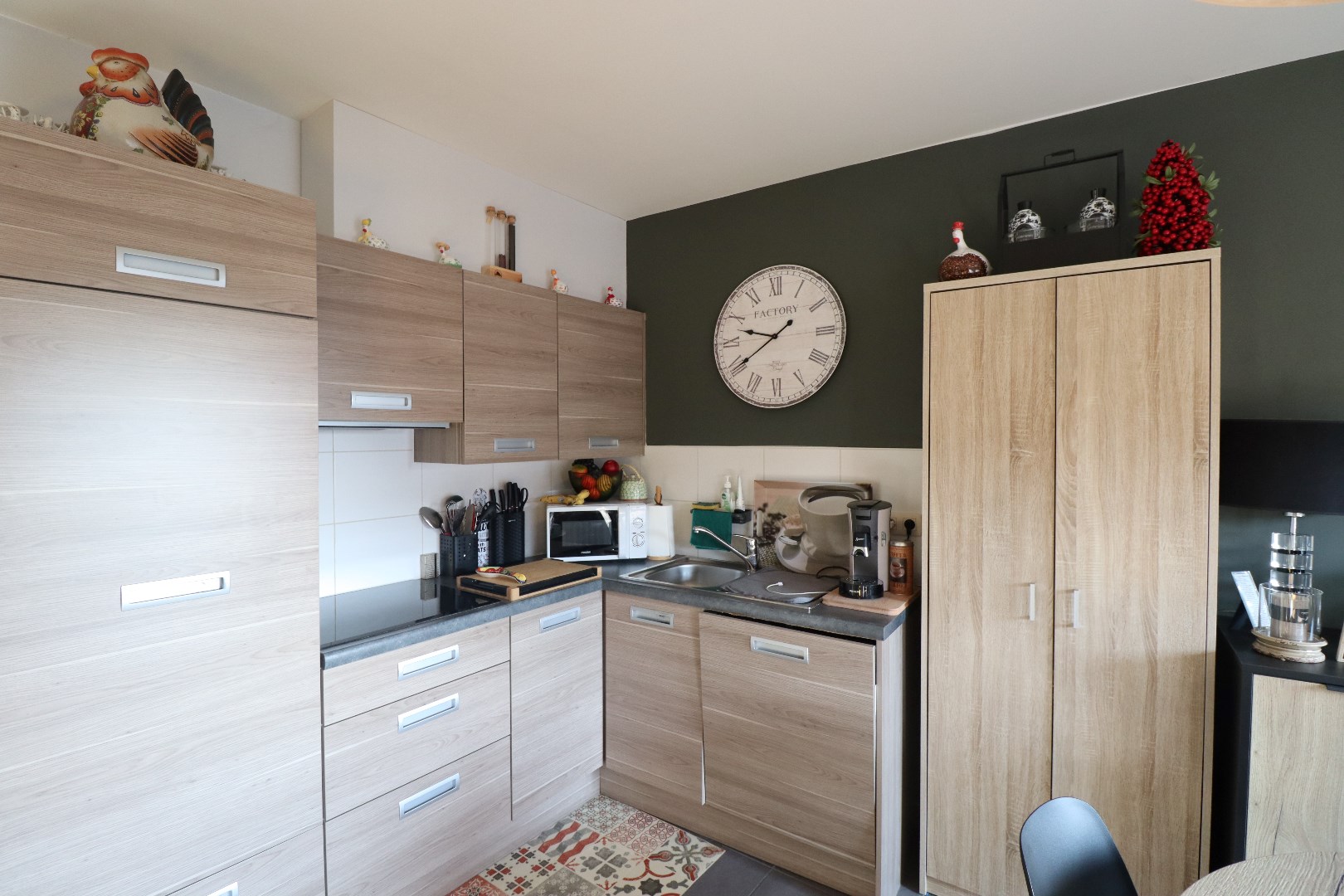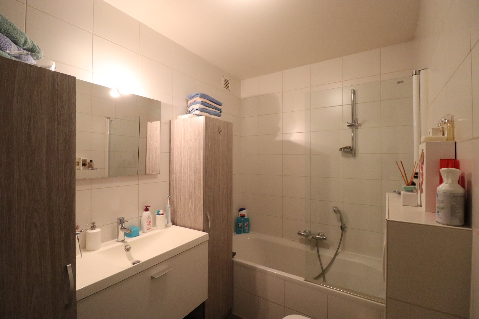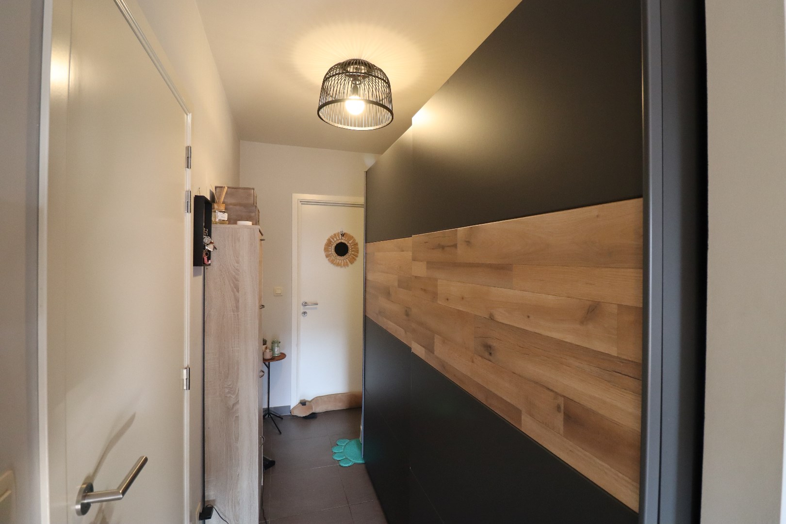 De indeling: we komen binnen in de gemeenschappelijke inkomhal, we nemen de trap naar de 1ste verdieping (er is geen lift aanwezig.) Vervolgens komen we de woning binnen en bevinden we ons in de open keuken met daaraan de open en lichtrijke leefruimte, de keuken is voorzien van alle modern comfort. Verder hebben we de grote slaapkamer en de badkamer met ligbad en douche.