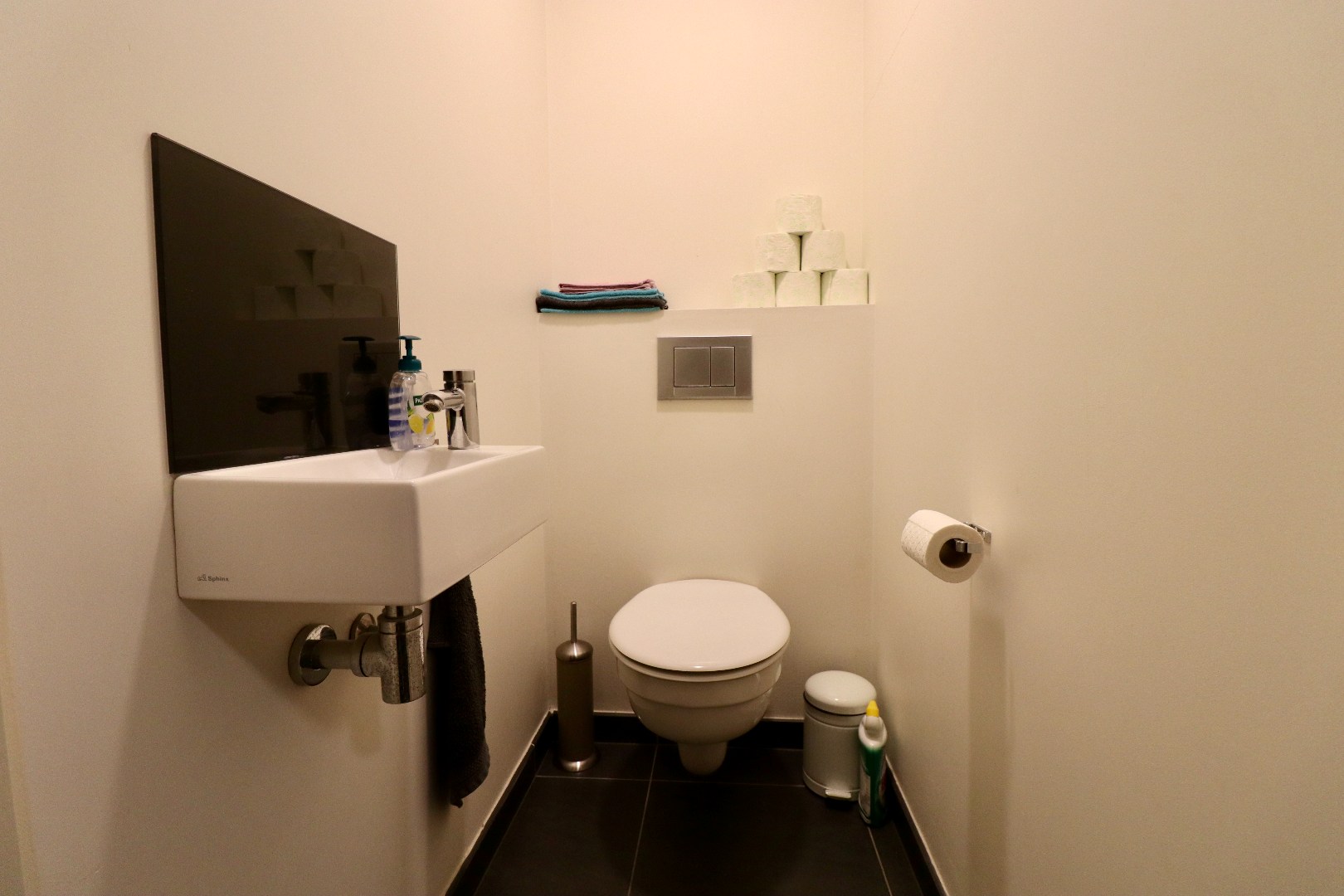 Indeling: ruime inkomhal met vestiairemogelijkheid. Lichtrijke woonkamer met open keuken, de keuken is geïnstalleerd met kasten en toestellen (o.a. een vaatwasser). Berging met aansluiting voor het wasmachine en de droogkast. Gastentoilet. Badkamer met inloopdouche en enkel lavabomeubel. Twee slaapkamers (achteraan met aansluitend de tuin). Via de tuin kunt u naar de achterliggende garages.