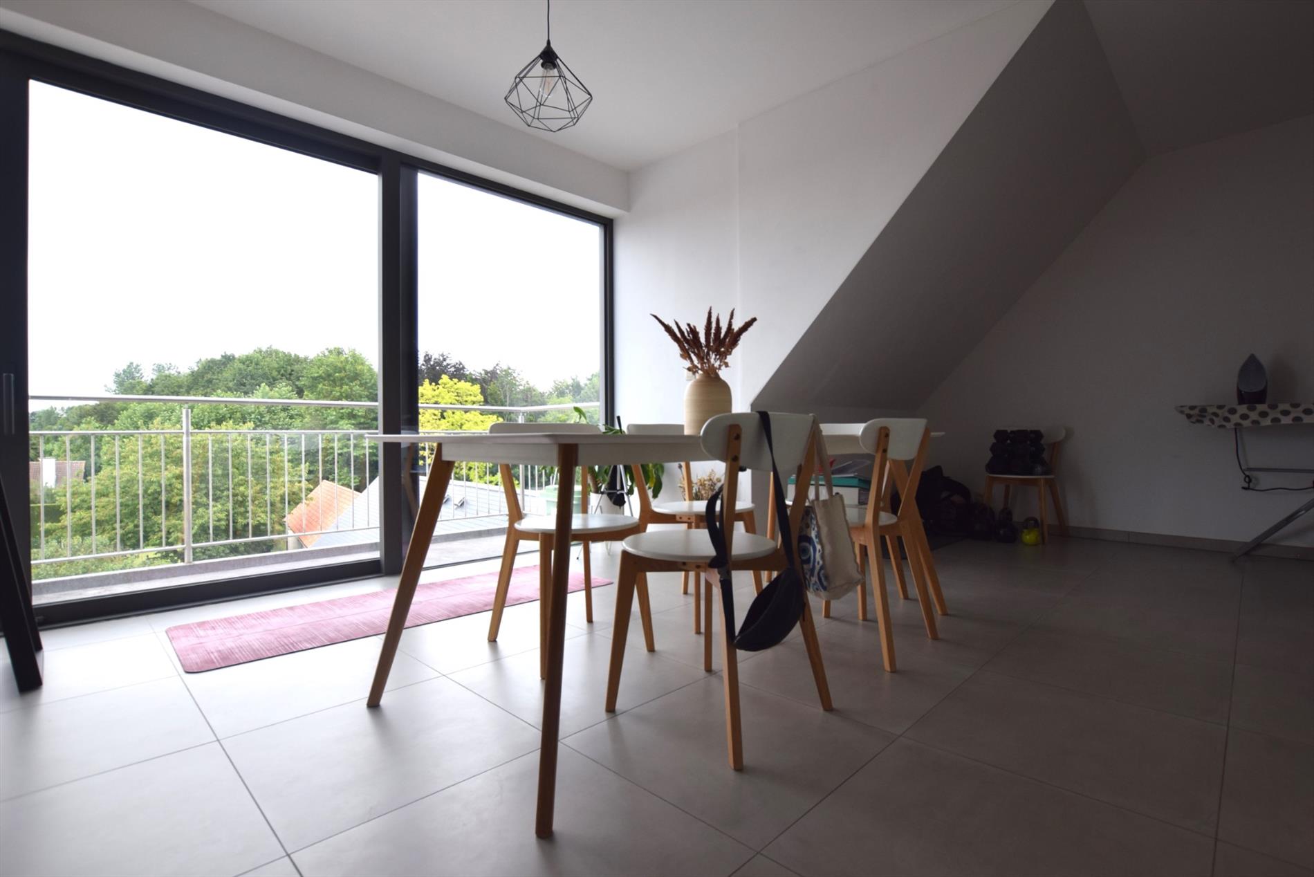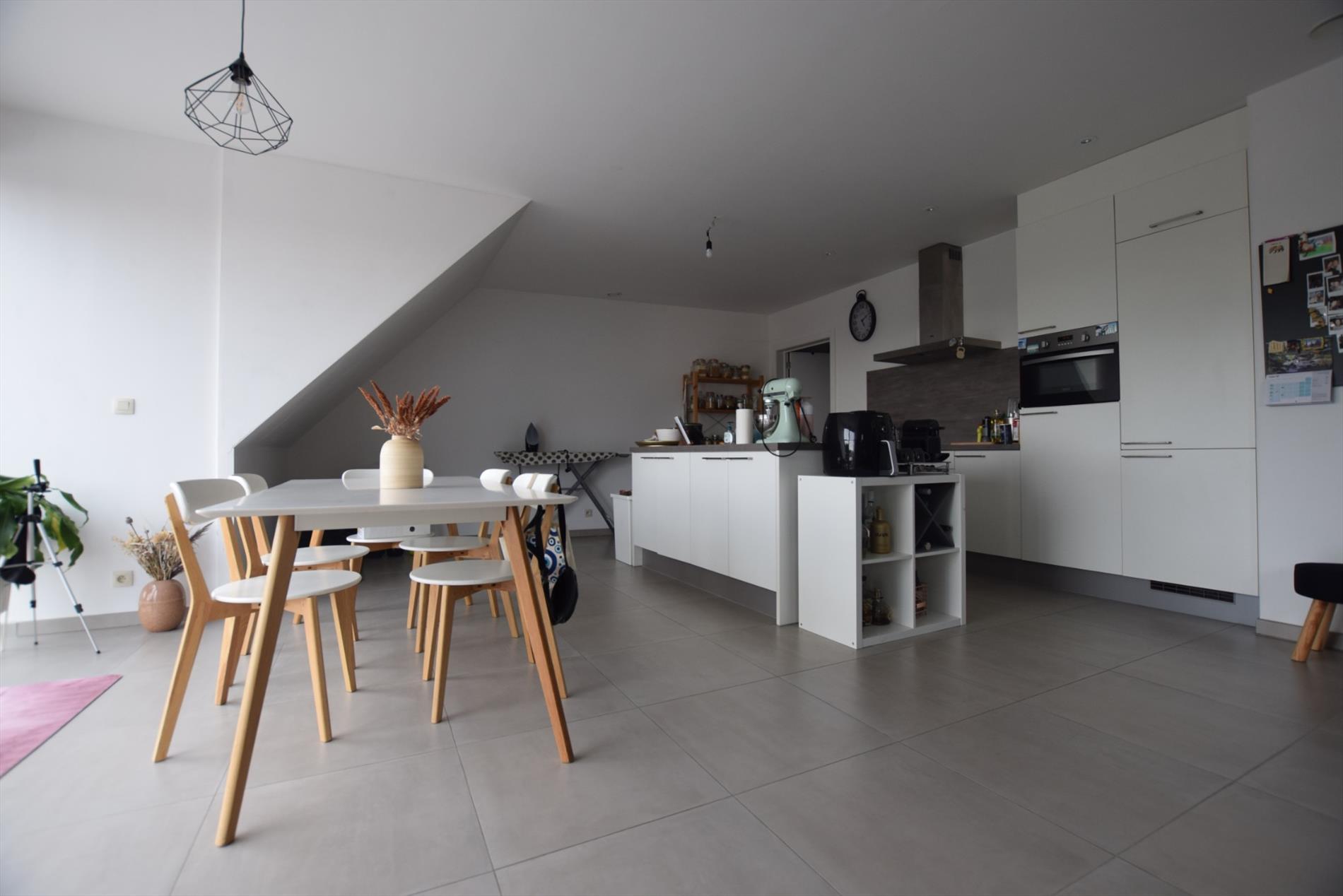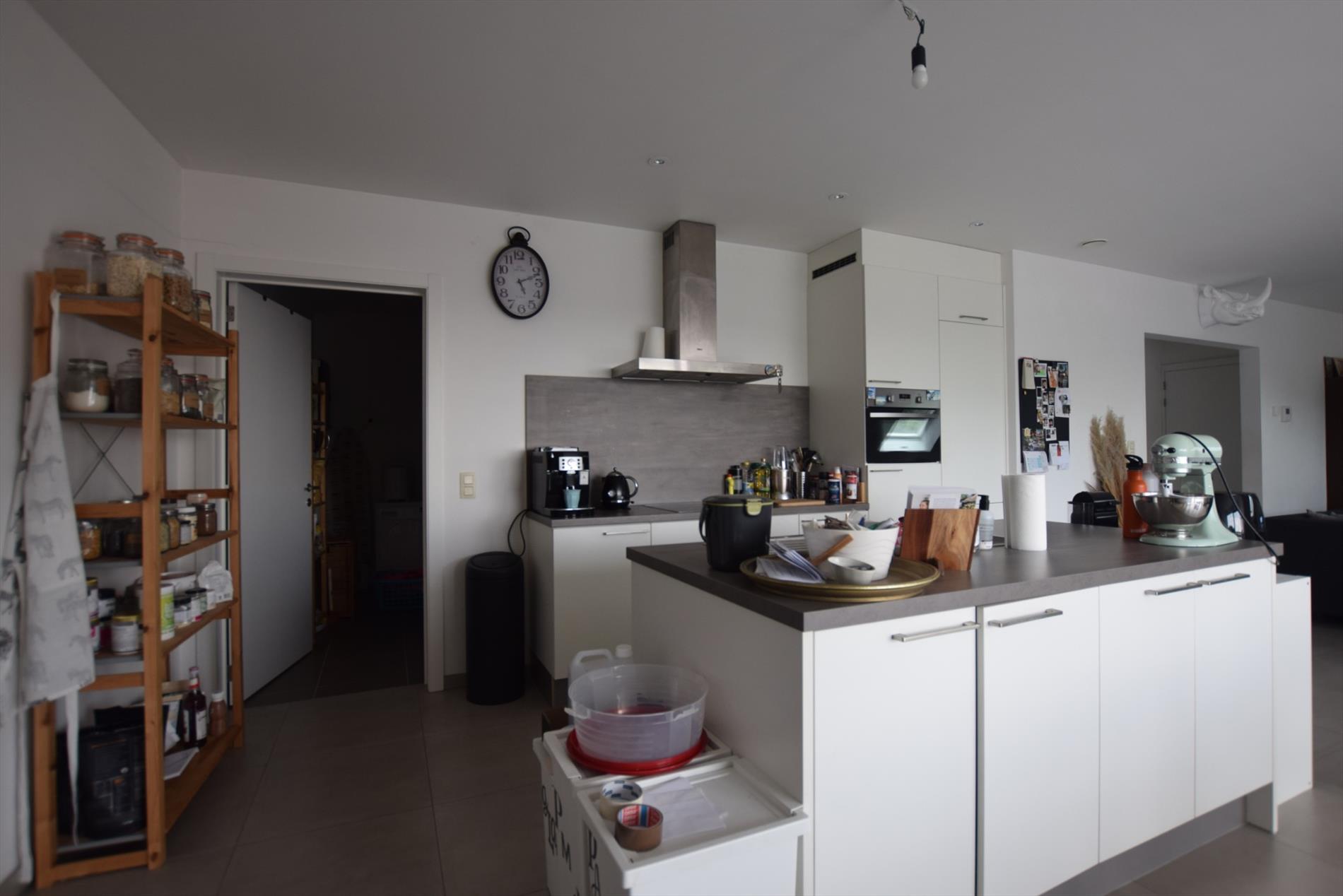 Derde verdieping: U komt het appartement binnen in de inkomhal waar er ruimte voorzien is voor vestiaire. Het appartement beschikt over een ruime eet- en leefruimte met een open en moderne eilandkeuken volledig uitgerust met alle nodige comfort: een grote koelkast, een aparte diepvriezer, een combi oven en een vaatwasmachine. Naast de keuken bevindt er zich ook nog een berging met de nodige aansluitingen. Vanuit de eet- en leefruimte kan u zich ook begeven naar het terras waar u een mooi uitzicht op de natuur, het groen verkrijgt. Verder beschikt het appartement nog over twee slaapkamers waarvan één grote slaapkamer en een badkamer met inloopdouche.