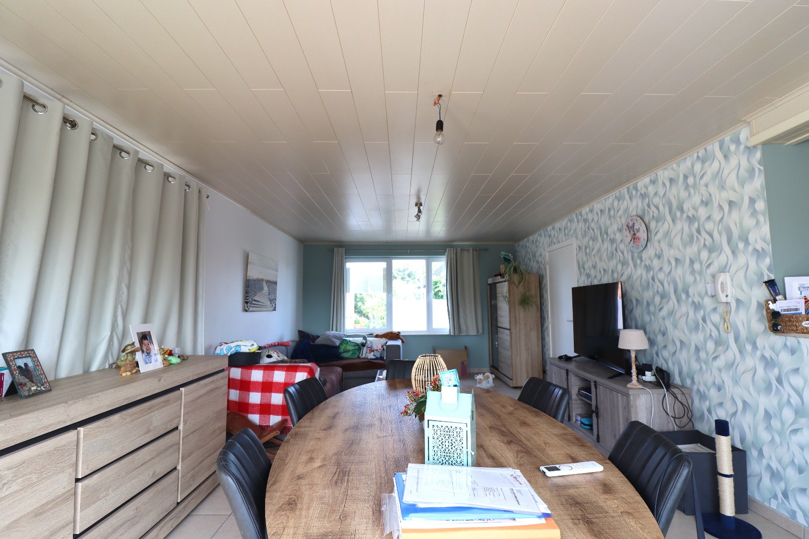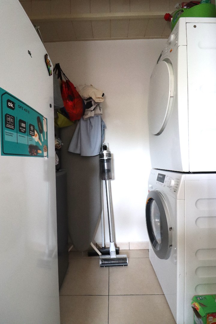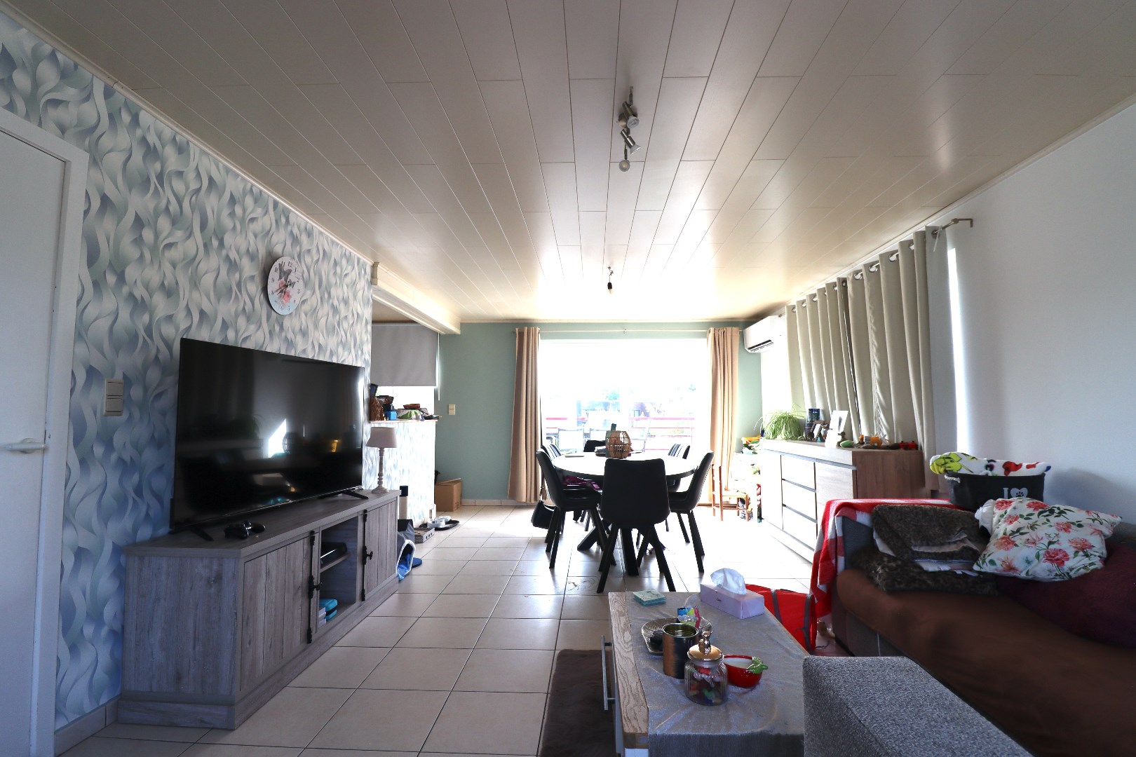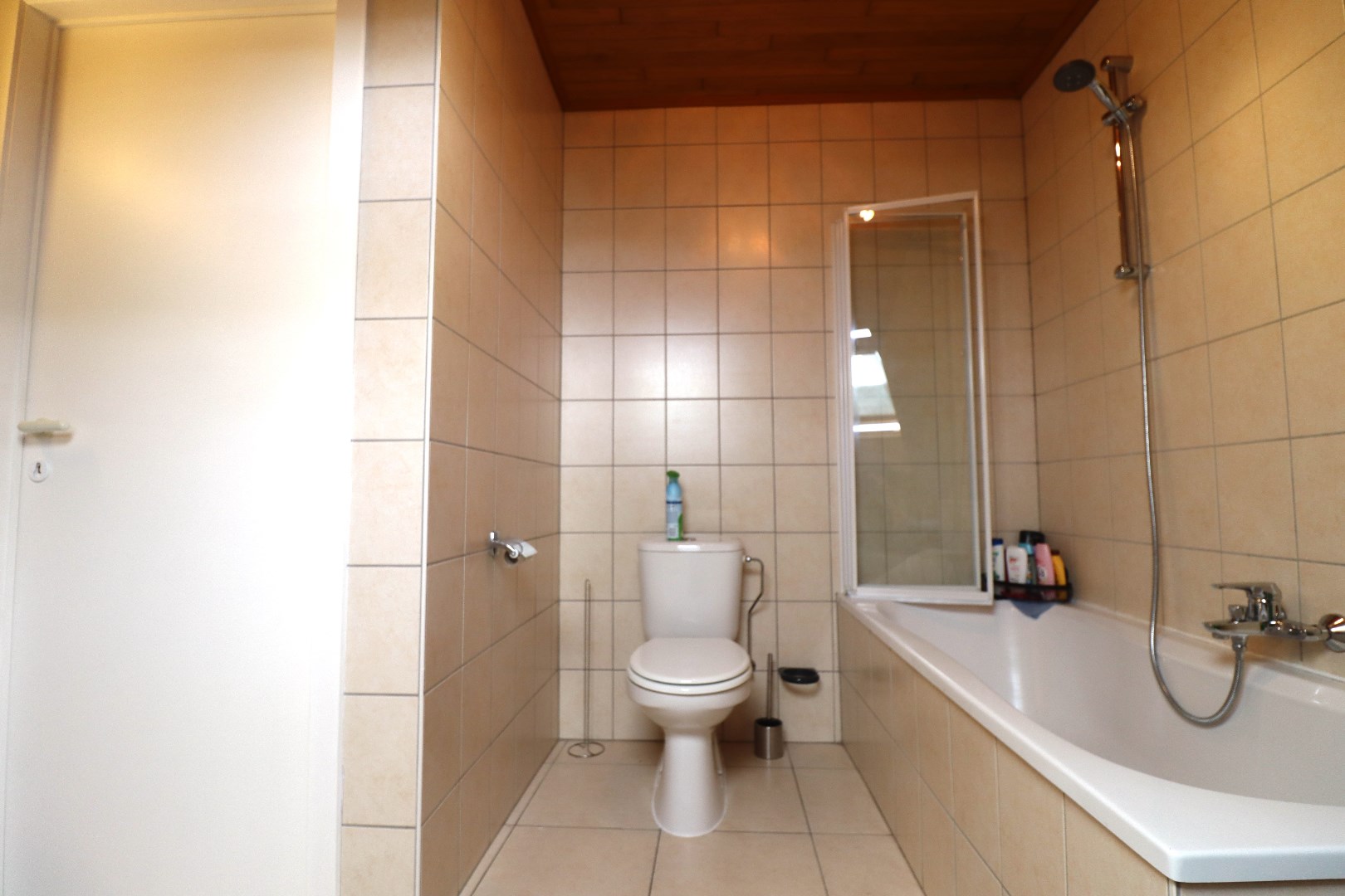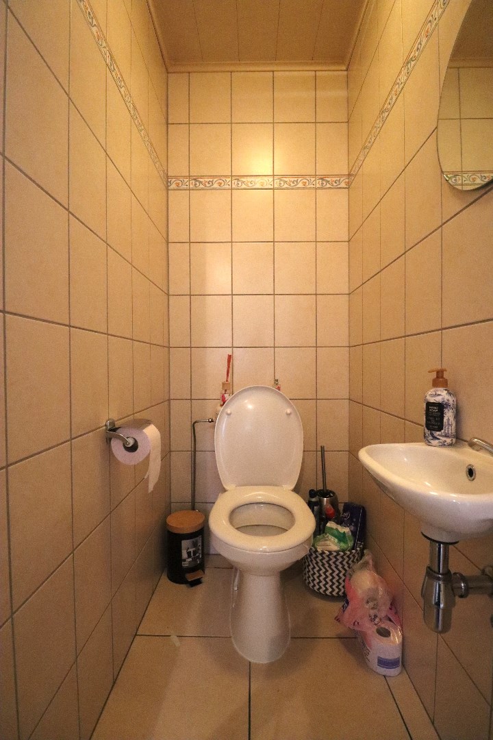 Indeling eerste verdieping: lichtrijke leefruimte met deels open keuken. De keuken is voorzien van de nodige toestellen. Berging met aansluiting voor het wasmachine en de droogkast. Gastentoilet. Ruim én zonnig dakterras met een prachtig uitzicht over de diepe tuin achteraan.