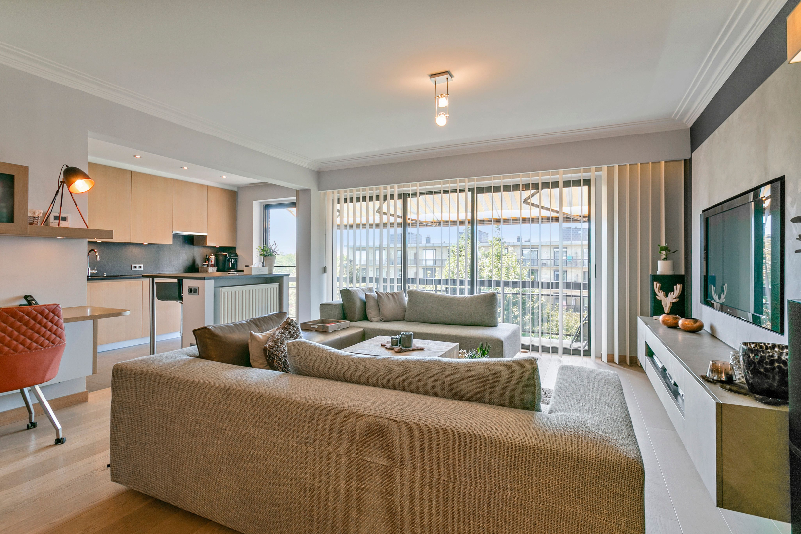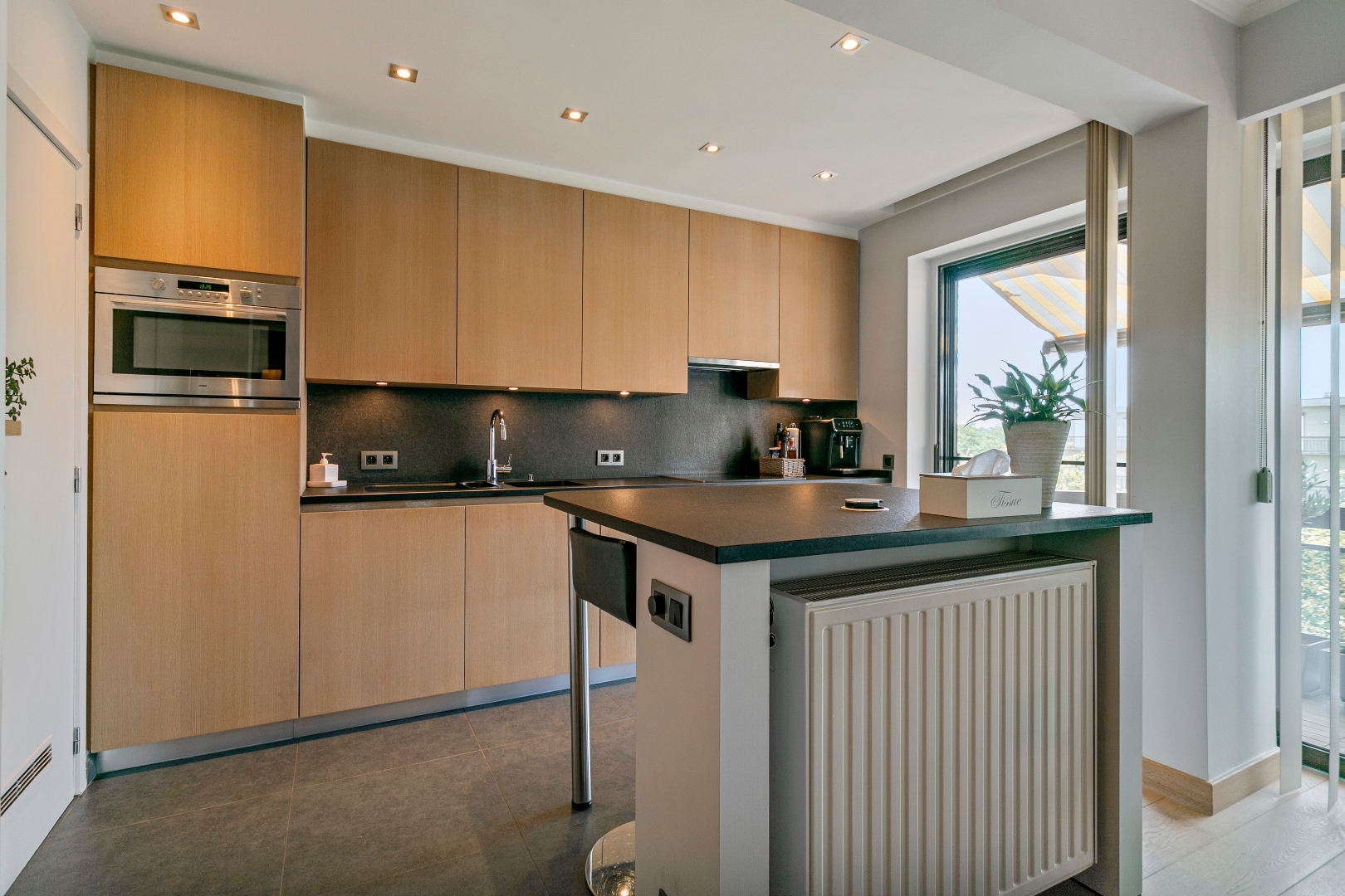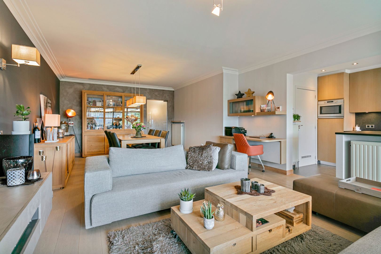 De sfeervolle en lichtrijke woonkamer is voorzien van een volle eiken parketvloer met een aangrenzende open keuken met kookeiland. Deze is volledig geïnstalleerd met kwalitatieve apparaten van ATAG en werd afgewerkt met een natuurstenen werkblad. Naast de keuken bevindt zich een berging waar aansluiting is voor wasmachine en droogkast en die eveneens voorzien is van een condensatieketel.
