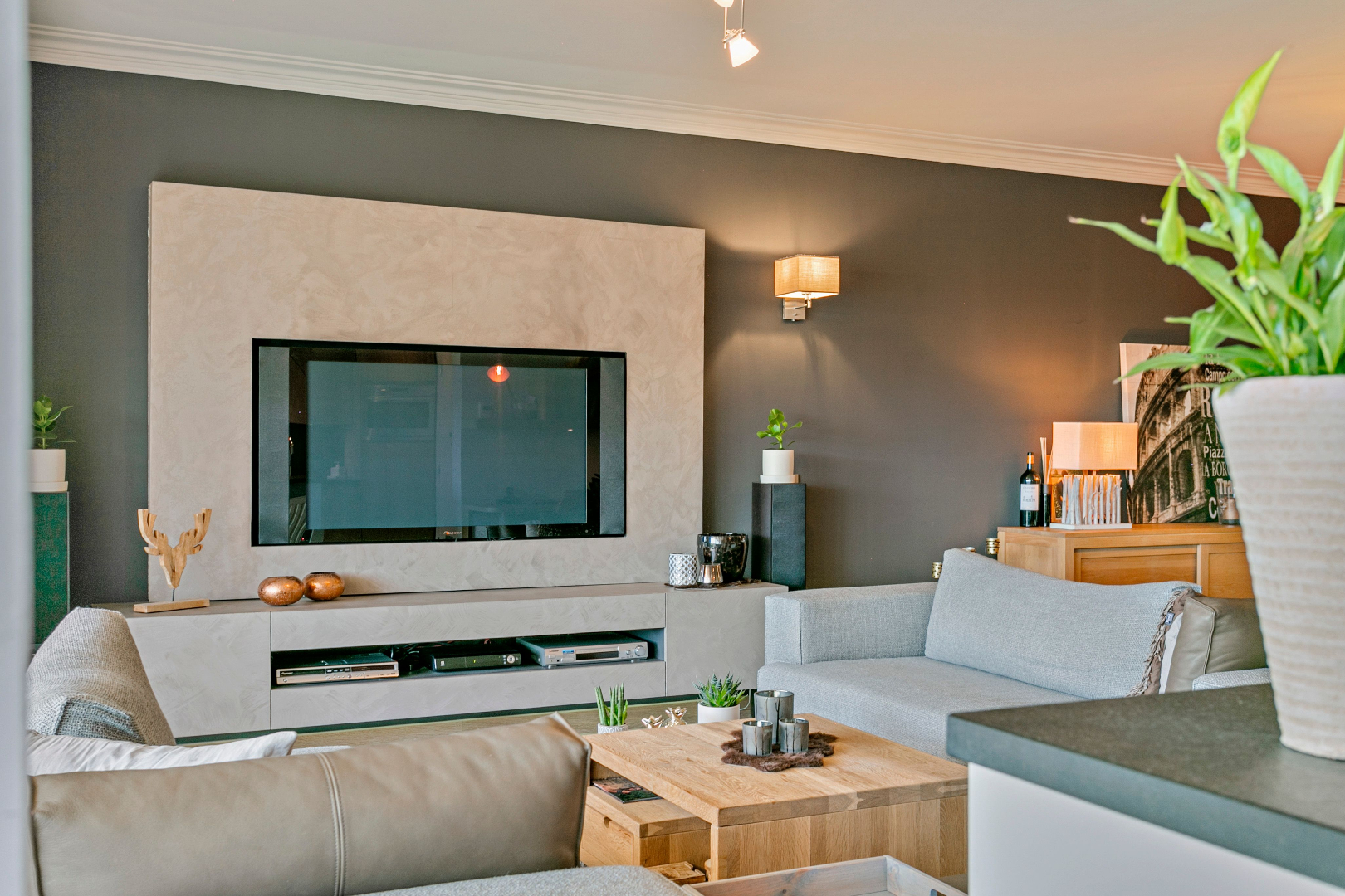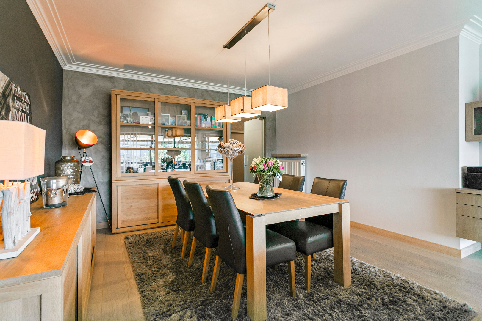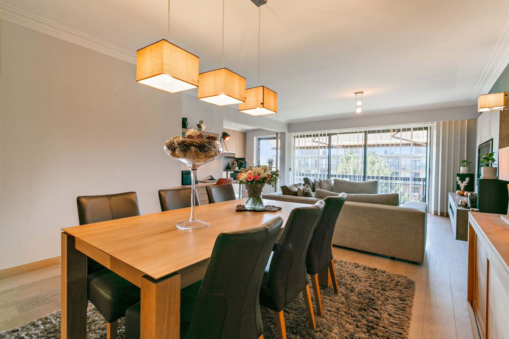 De sfeervolle en lichtrijke woonkamer is voorzien van een volle eiken parketvloer met een aangrenzende open keuken met kookeiland. Deze is volledig geïnstalleerd met kwalitatieve apparaten van ATAG en werd afgewerkt met een natuurstenen werkblad. Naast de keuken bevindt zich een berging waar aansluiting is voor wasmachine en droogkast en die eveneens voorzien is van een condensatieketel.