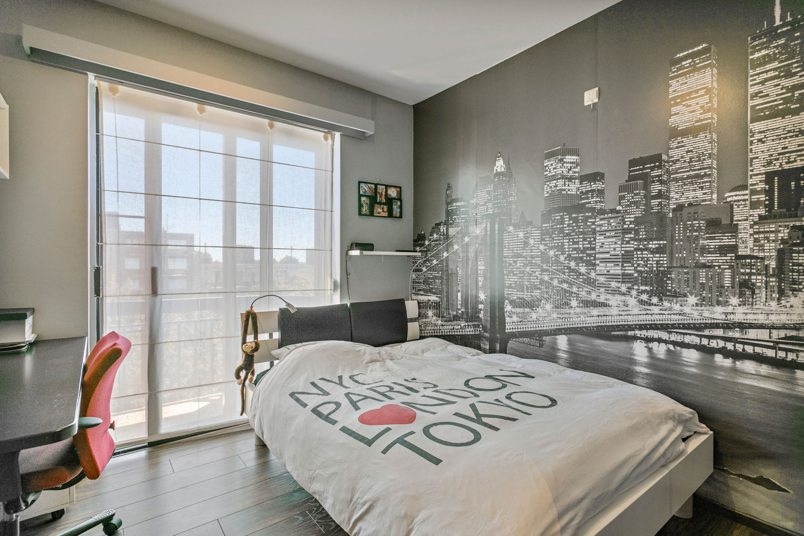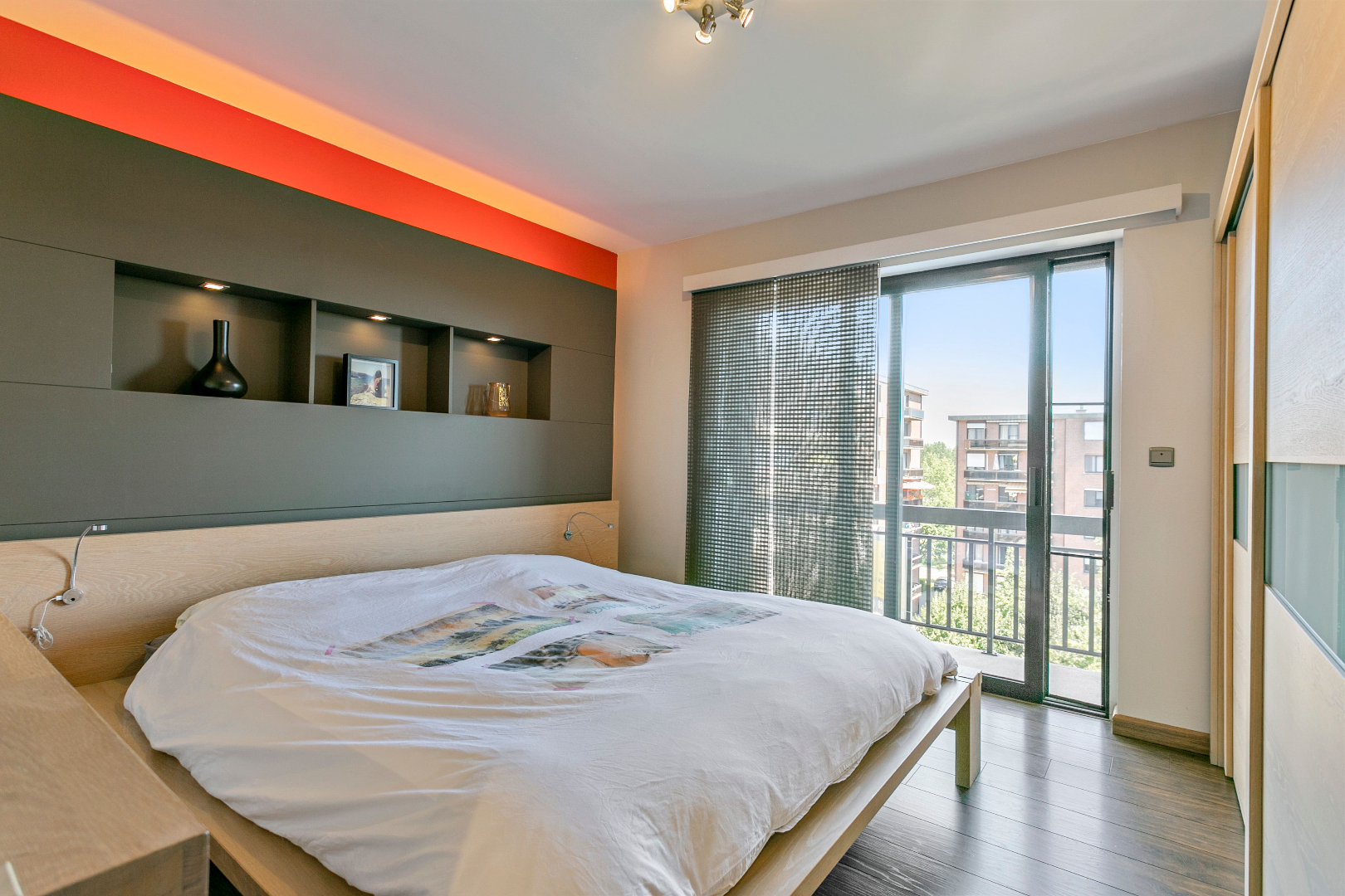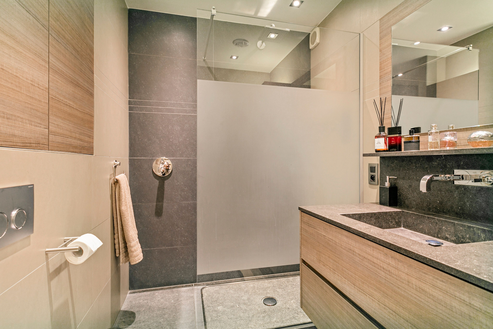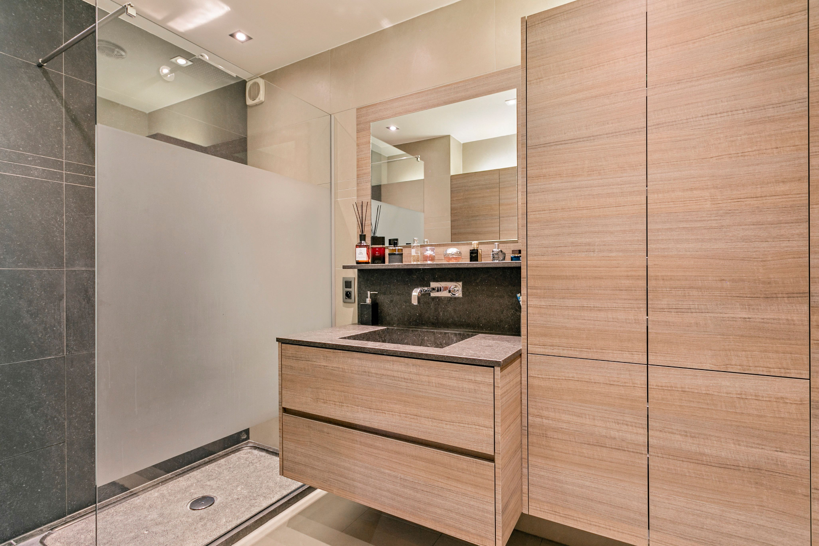 De ruime inkomhal met videoparlofoon verleent toegang tot een apart gastentoilet, 2 ruime slaapkamers die beiden voorzien zijn van rolluiken. Daarnaast is ook een bureauruimte voorzien die perfect kan gebruikt worden als derde slaapkamer of dressing. De hall geeft eveneens toegang tot de volledig vernieuwde badkamer. Deze werd gerenoveerd met hoogwaardige materialen en is voorzien van een inloopdouche in natuursteen, een lavabomeubel, hangtoilet en handdoekdroger.