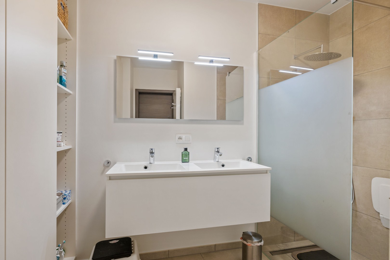 Het appartement beschikt over drie volwaardige slaapkamers, voorzien van rolluiken en ingemaakte kasten. De badkamer is modern ingericht en uitgerust met een inloopdouche en dubbele lavabo. Daarnaast is er nog een apart toilet.
