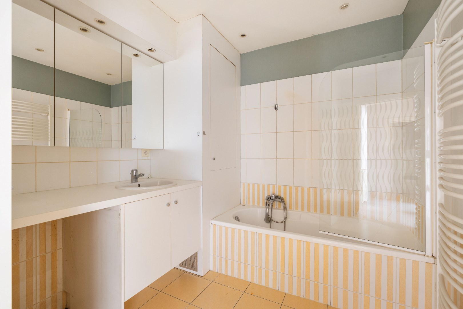 Dit appartement van 109 m² biedt ruimte, licht en comfort op een uitstekende locatie. Met een EPC-label C, dubbele beglazing in PVC en geen asbestmaterialen is de basis alvast in orde. De leefruimte met open haard en blokparket heeft karakter, en met wat liefde kan dit een echte thuis worden.
