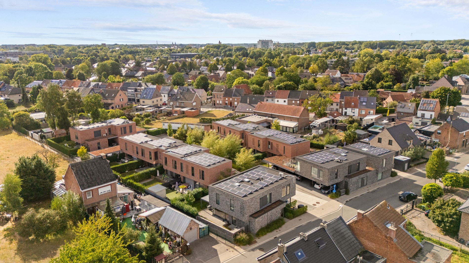 De open keuken is volledig uitgerust met spoelbak, vaatwasser, combi-oven, koelkast, inductiekookplaat en dampkap. Aansluitend bevindt zich een praktische berging met plaats voor wasmachine, droogkast en extra opbergruimte, alsook de technische ruimte met Vaillant-ketel, zonnepanelen (9x315Wp) en ventilatiesysteem type C van Renson.