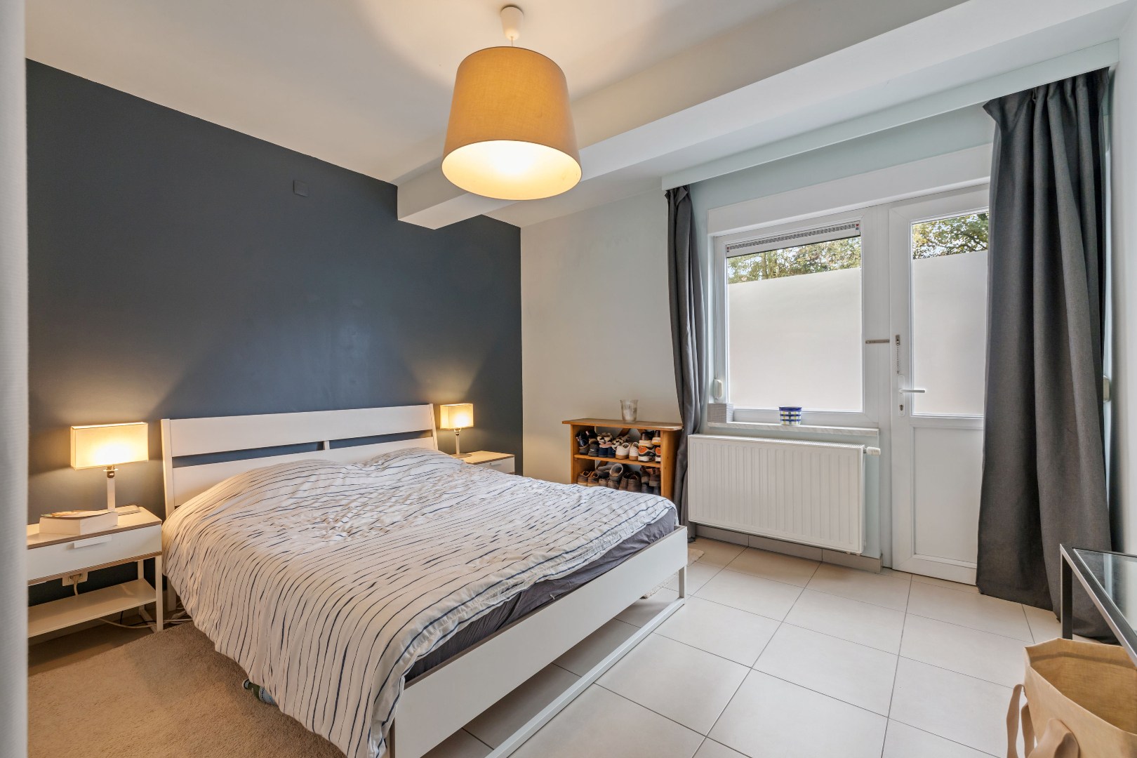 Het appartement beschikt over twee ruime slaapkamers, een verzorgde badkamer met bad, douche, toilet en dubbele wastafel, en een praktische berging met aansluiting voor wasmachine en droogkast. Achteraan is er een handige uitweg naar een zonnige gemeenschappelijke koer, ideaal om boodschappen uit te laden.