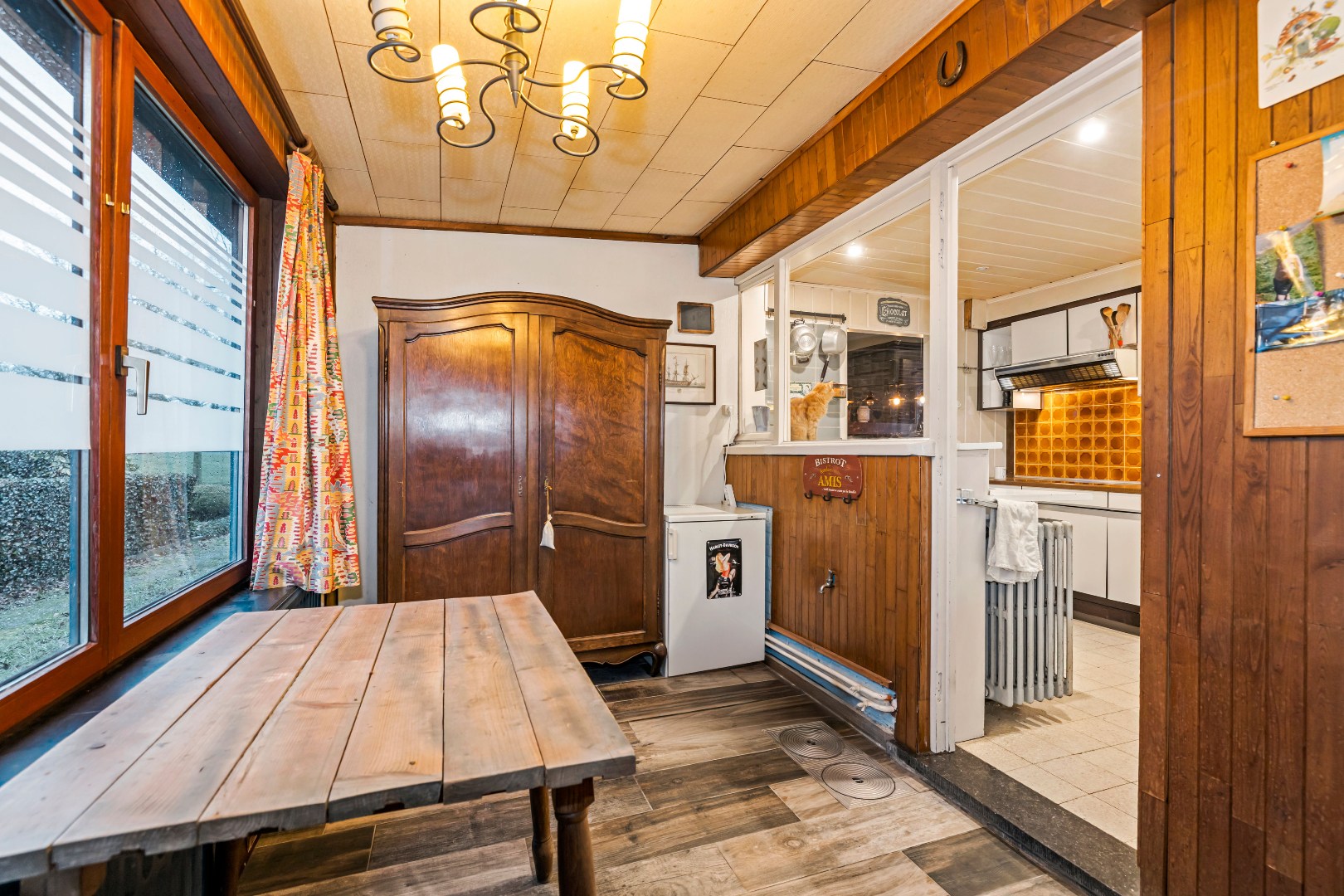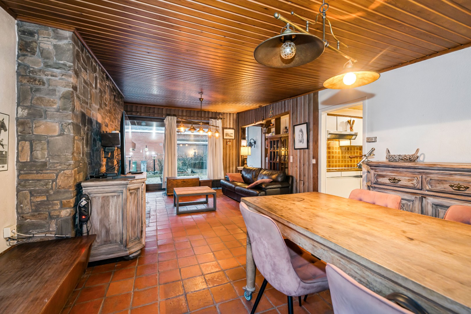 Binnenin beschikt de woning over een ruime en lichtrijke leefruimte met grote raampartijen die zorgen voor een aangename natuurlijke lichtinval. Aansluitend vind je de keuken, met daarnaast een praktische berging en een veranda.