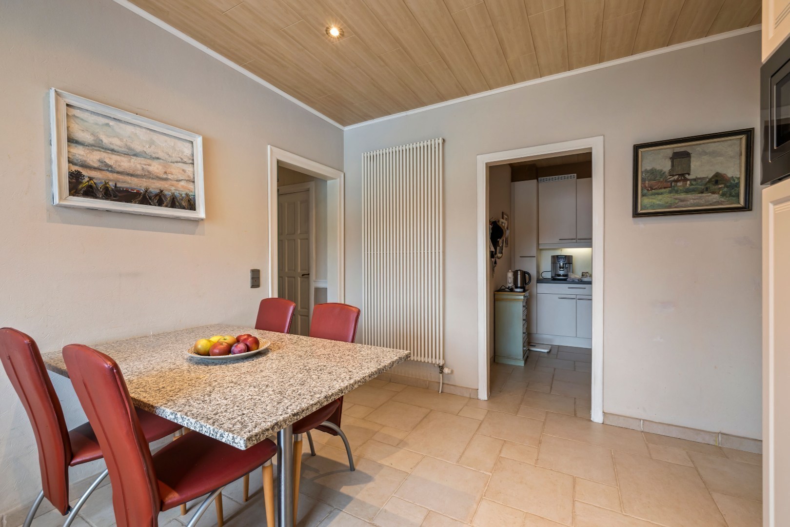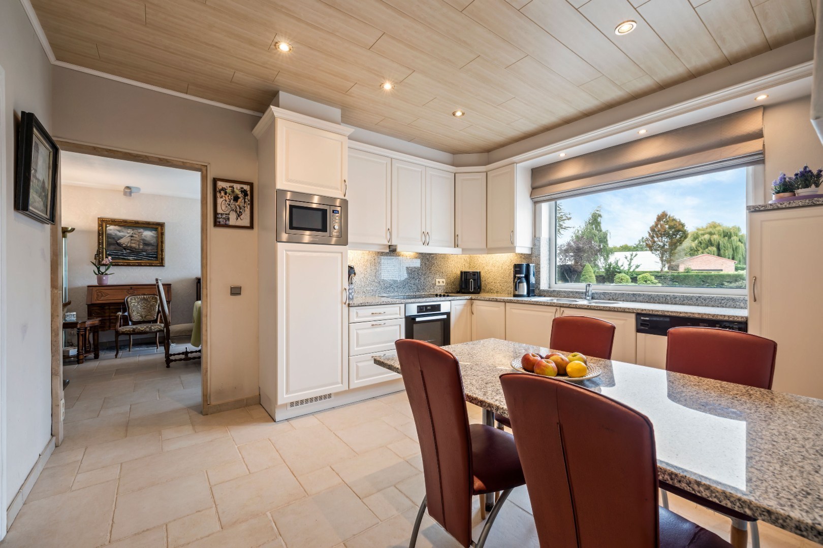 Bij het binnenkomen word je verwelkomd in een inkomhal met apart gastentoilet. Van hieruit loop je door naar de lichtrijke leefruimte met prachtig zicht op de tuin. Aansluitend bevindt zich de volledig geïnstalleerde keuken met ontbijthoek, aangevuld met een handige bijkeuken.