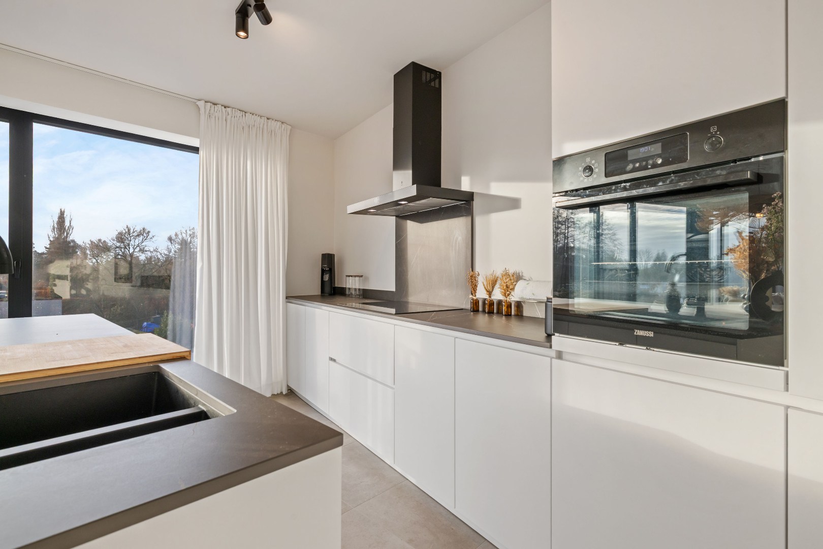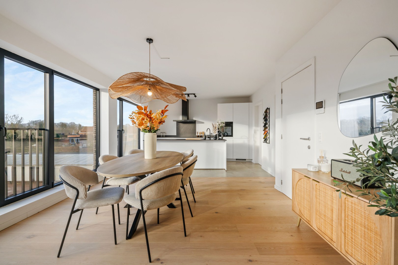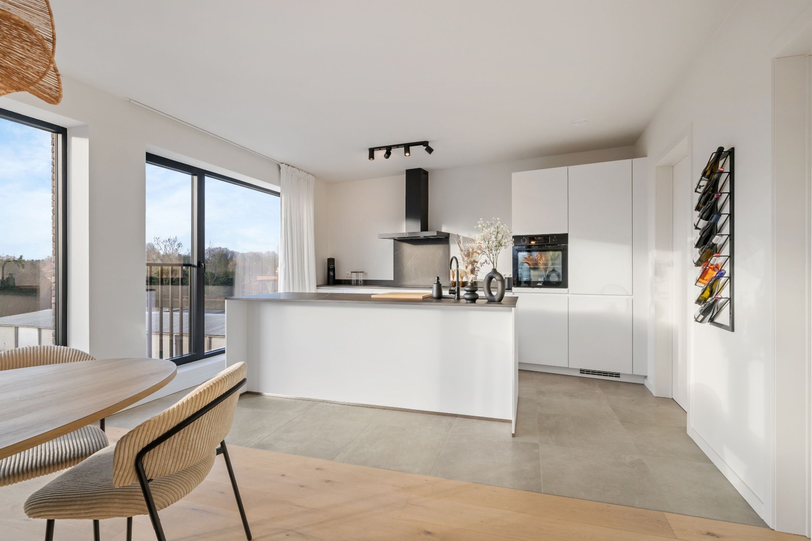 Je komt binnen in een lichtrijke leefruimte waar de grote raampartijen meteen in het oog springen. Dankzij de zuidelijke oriëntatie geniet je hier van veel natuurlijk licht en mooie, open vergezichten, aangezien het appartement boven de omliggende woningen uitsteekt. De leefruimte sluit naadloos aan op de open keuken, die volledig is uitgerust met alle hedendaagse toestellen en een praktische ontbijthoek.
