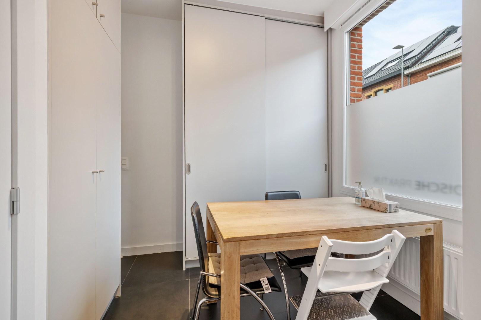 We betreden de woning via de centrale inkomhal. Die geeft ons direct toegang tot de praktijkruimte met apart toilet. De gezellige, lichtrijke en grote leefruimte staat in rechtstreeks contact met de open keuken die is voorzien van keramische kookplaat, dampkap, vaatwasser, ijskast, diepvries, oven en met eetplaats.