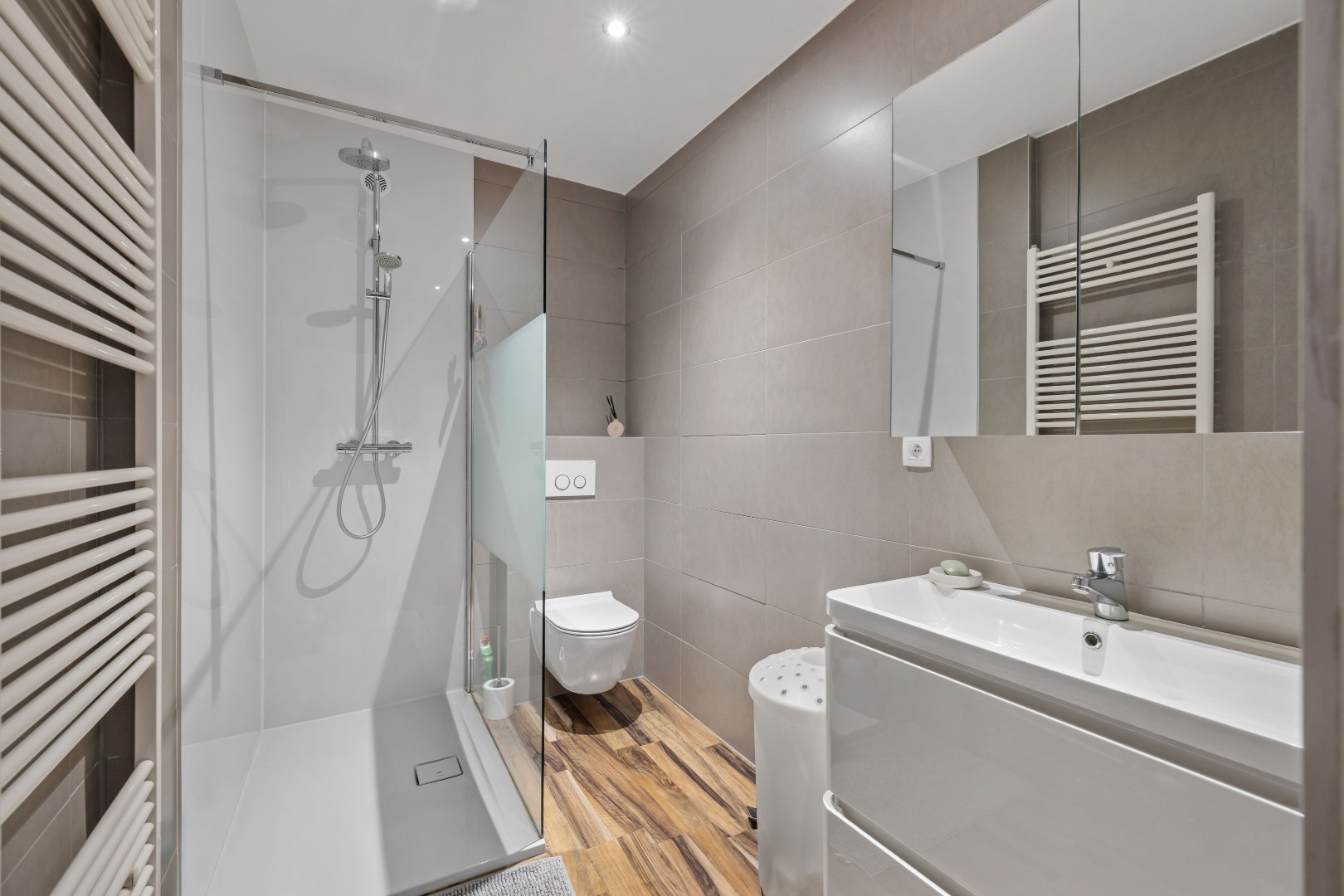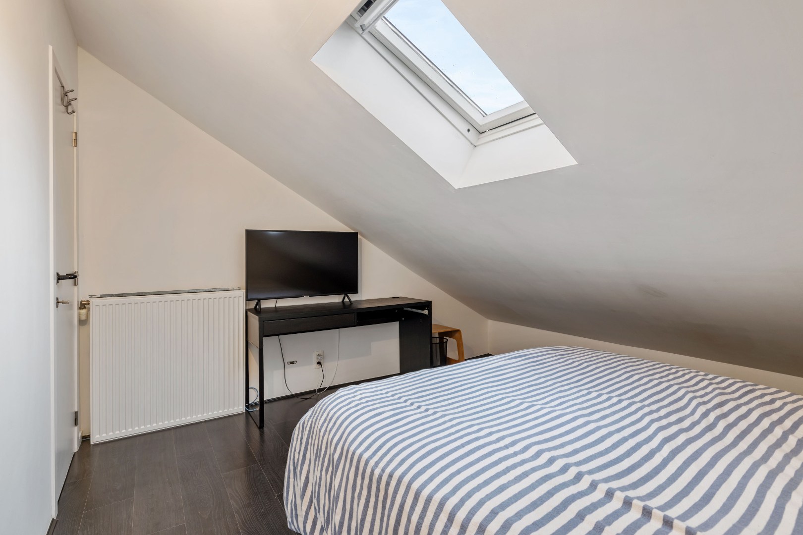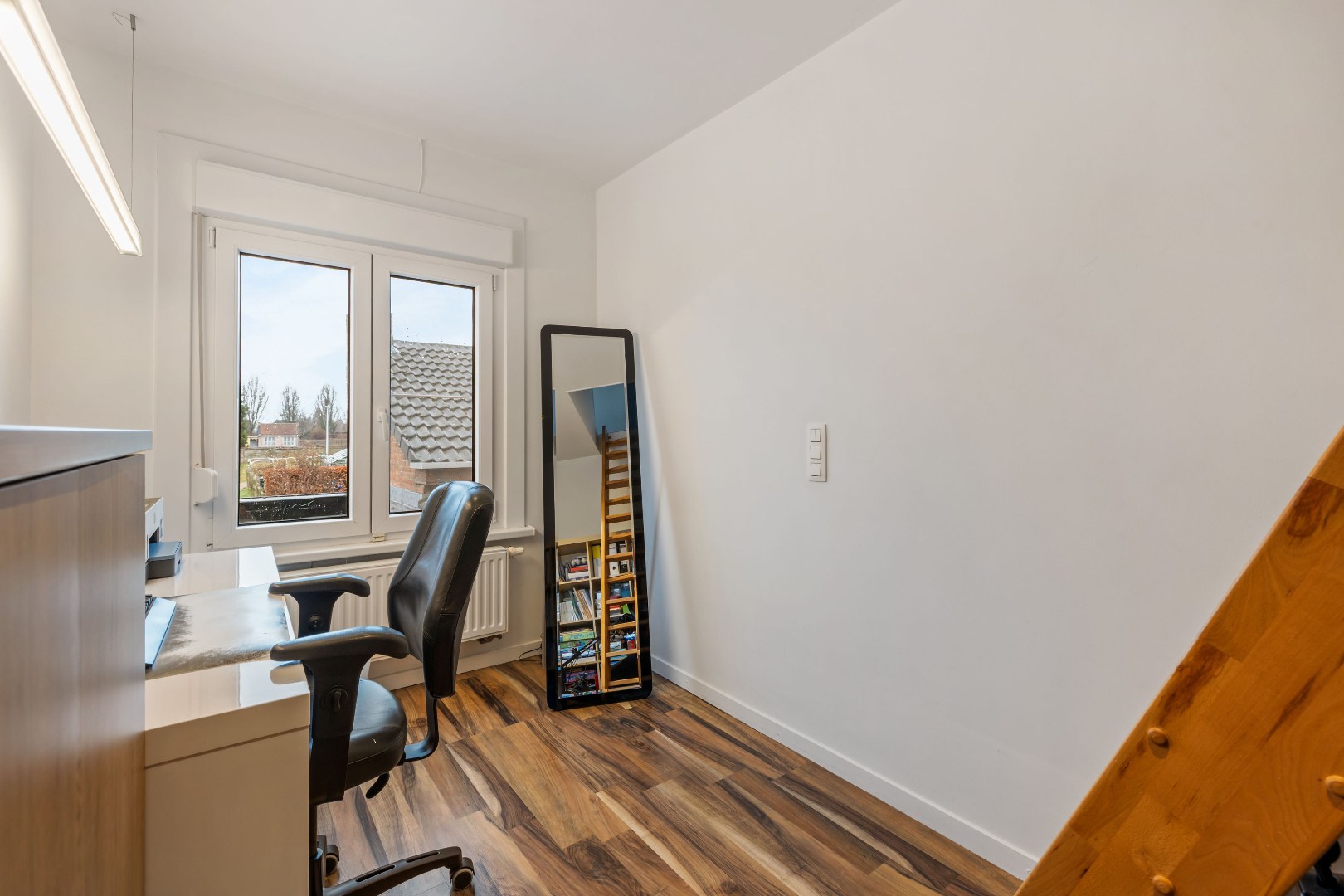 Op de eerste verdieping vinden we de badkamer die is voorzien van toilet, douche en enkele wastafel. Verder op deze verdieping vinden we een grote slaapkamer en een bureauruimte. Op de zolderverdieping bevinden zich nog twee slaapkamers.