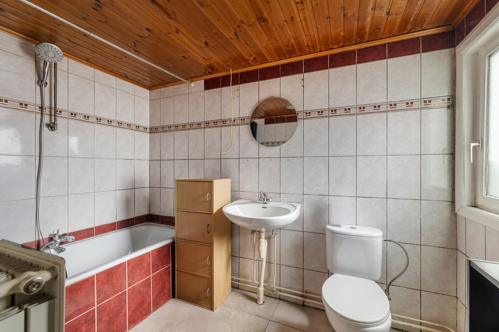 Bij het binnenkomen word je verwelkomd in een inkomhal die leidt naar de gezellige leefruimte, aansluitend de functionele keuken en achteraan de badkamer met toilet. Onder de trap bevindt zich nog een extra berging – handig als voorraadruimte of wasplaats.