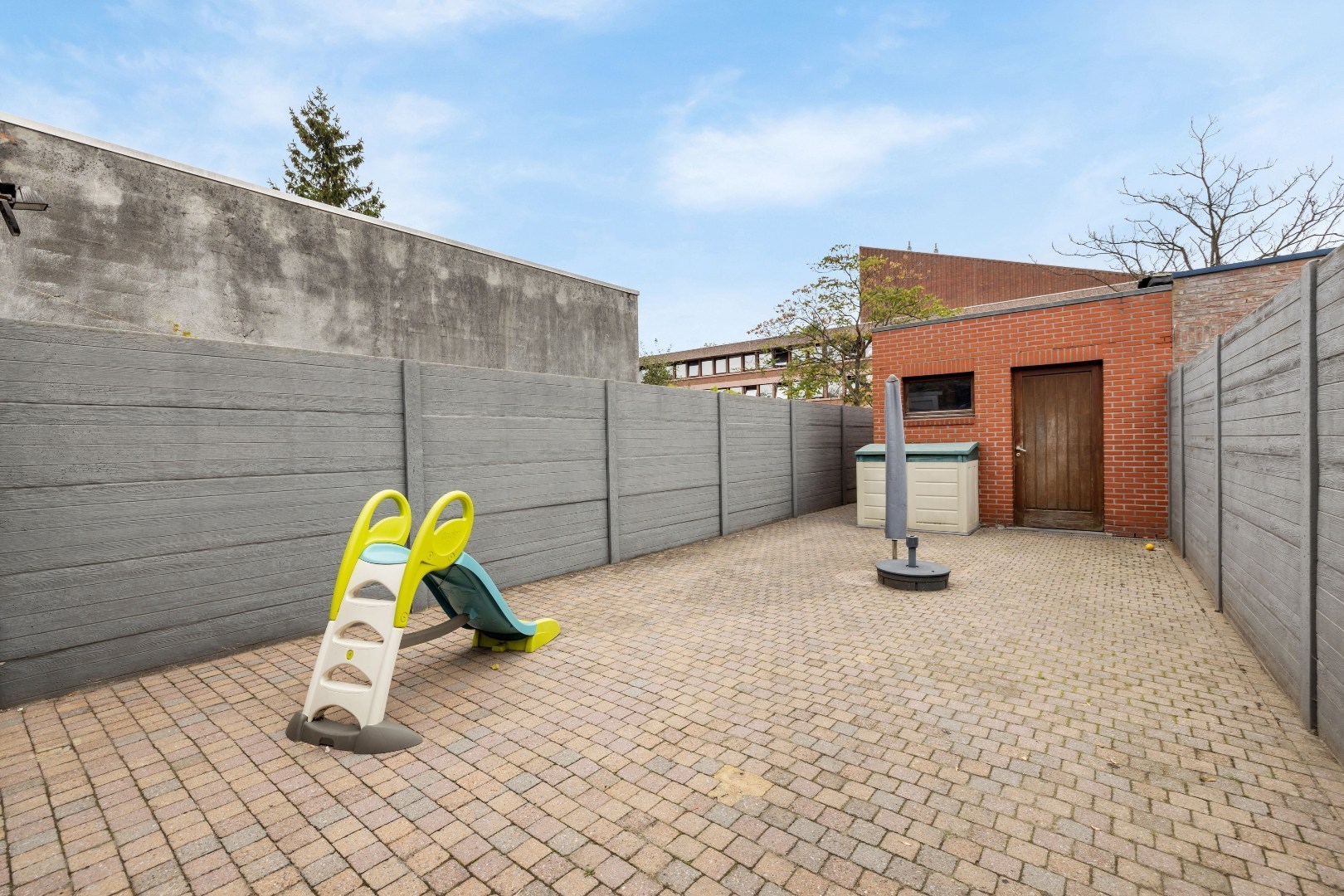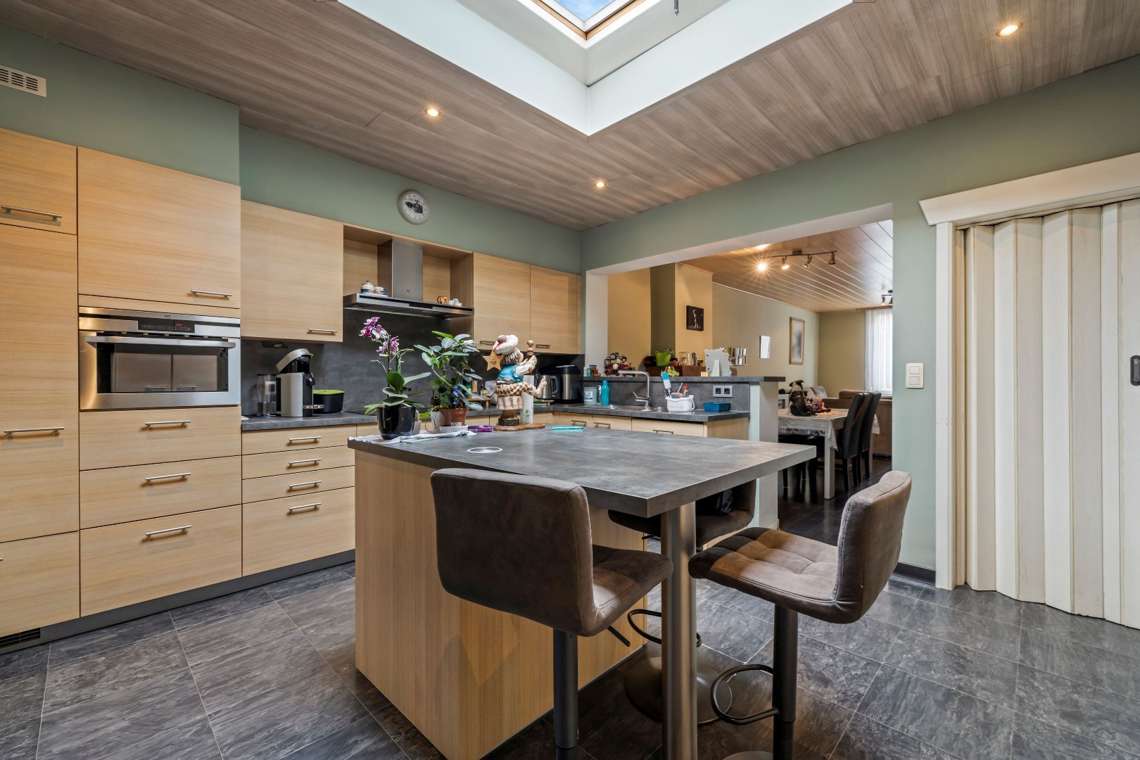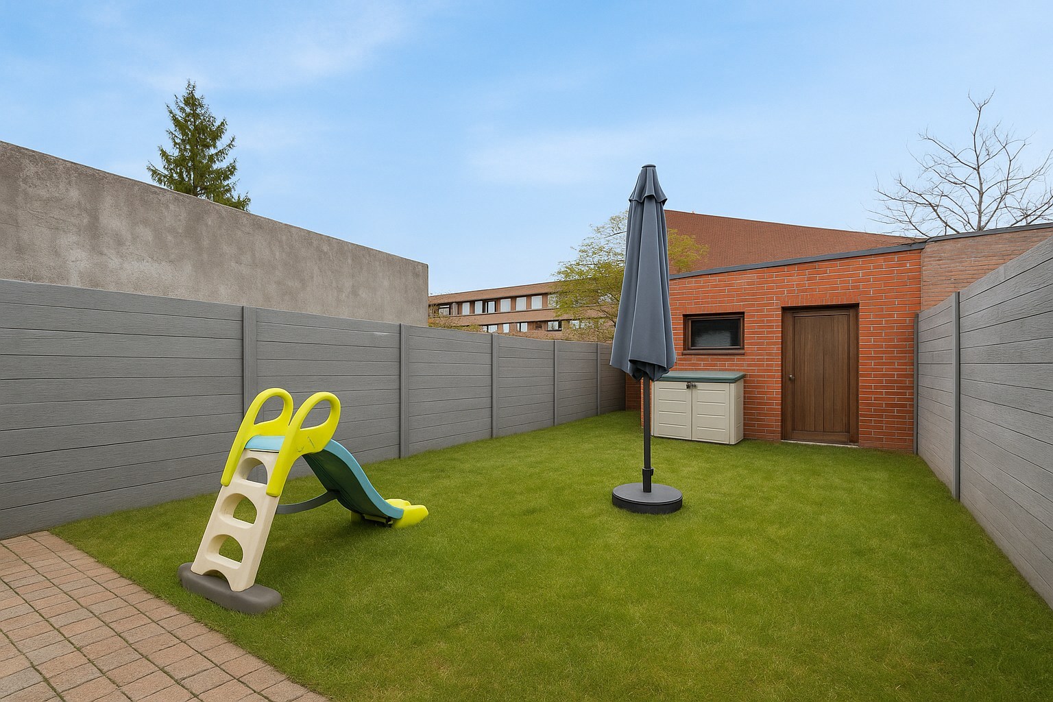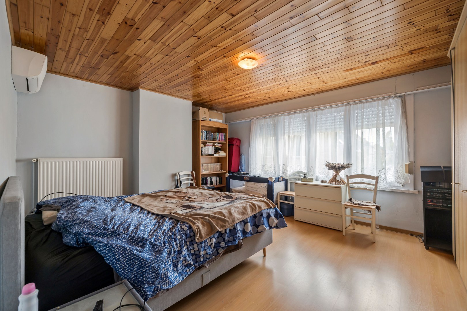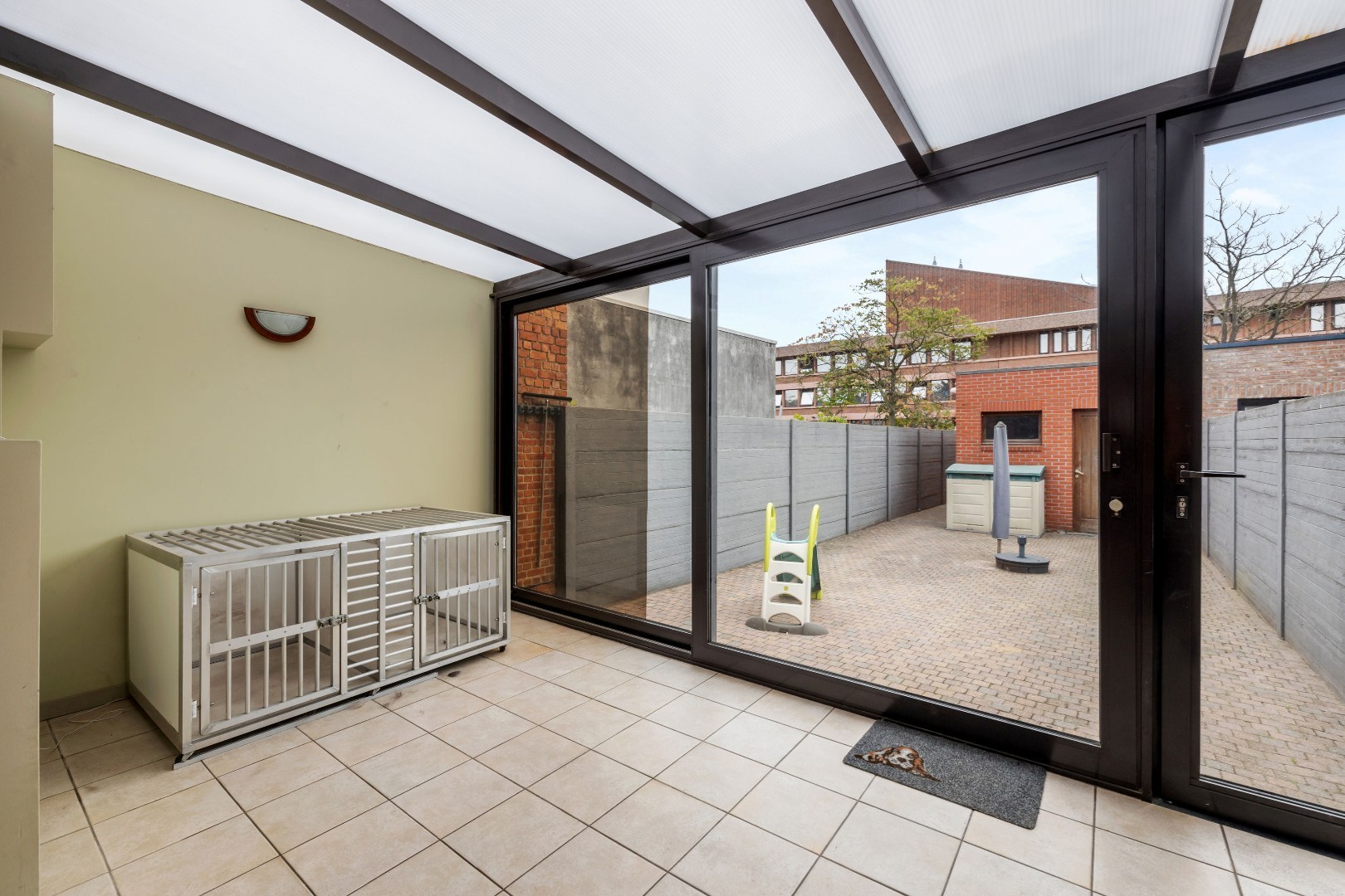 De woning beschikt over een garage achteraan de tuin, wat zorgt voor extra comfort en veiligheid. Binnen geniet je van een aangename leefruimte met veel lichtinval en airco’s die zorgen voor een optimaal binnenklimaat, zowel in zomer als winter.