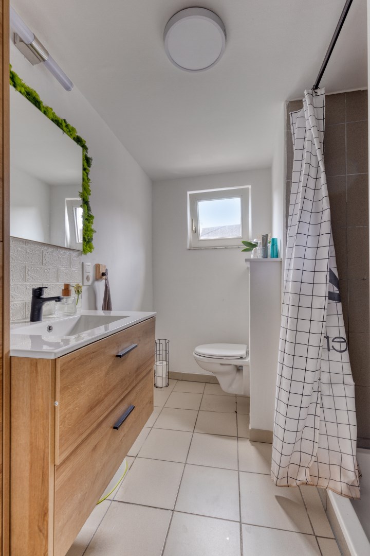 Op het gelijkvloers vindt u een ruime en lichtrijke leefruimte die overgaat in een functionele keuken met zicht op de gezellige tuin en het terras – ideaal om van zonnige dagen te genieten. De badkamer bevindt zich eveneens op het gelijkvloers en is uitgerust met toilet en alle nodige comfort.