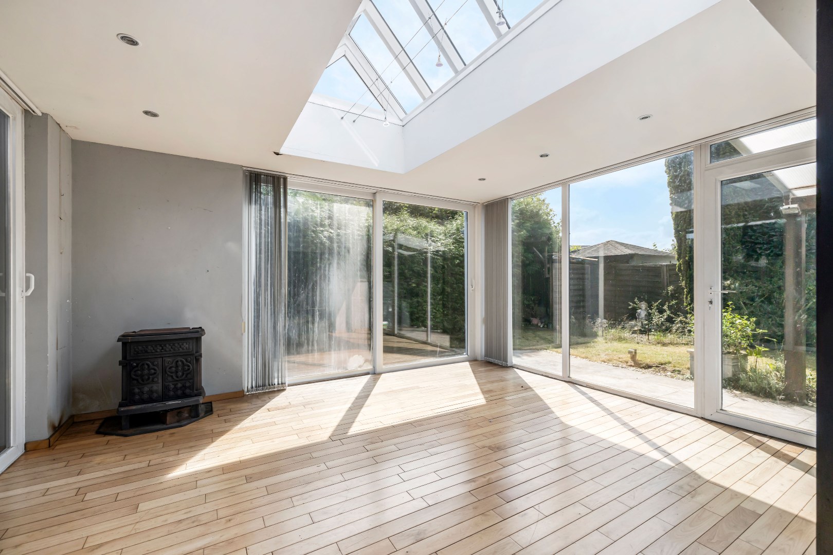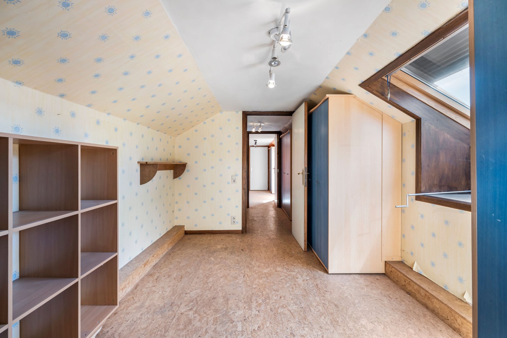 Op de gelijkvloerse verdieping bevinden zich ook twee slaapkamers, waarvan één een doorloopkamer is met een vaste trap naar boven. Deze configuratie biedt veel flexibiliteit, ideaal voor gezinnen of kandidaten die een slaapkamer beneden wensen. Een badkamer en een garage maken de begane grond compleet.