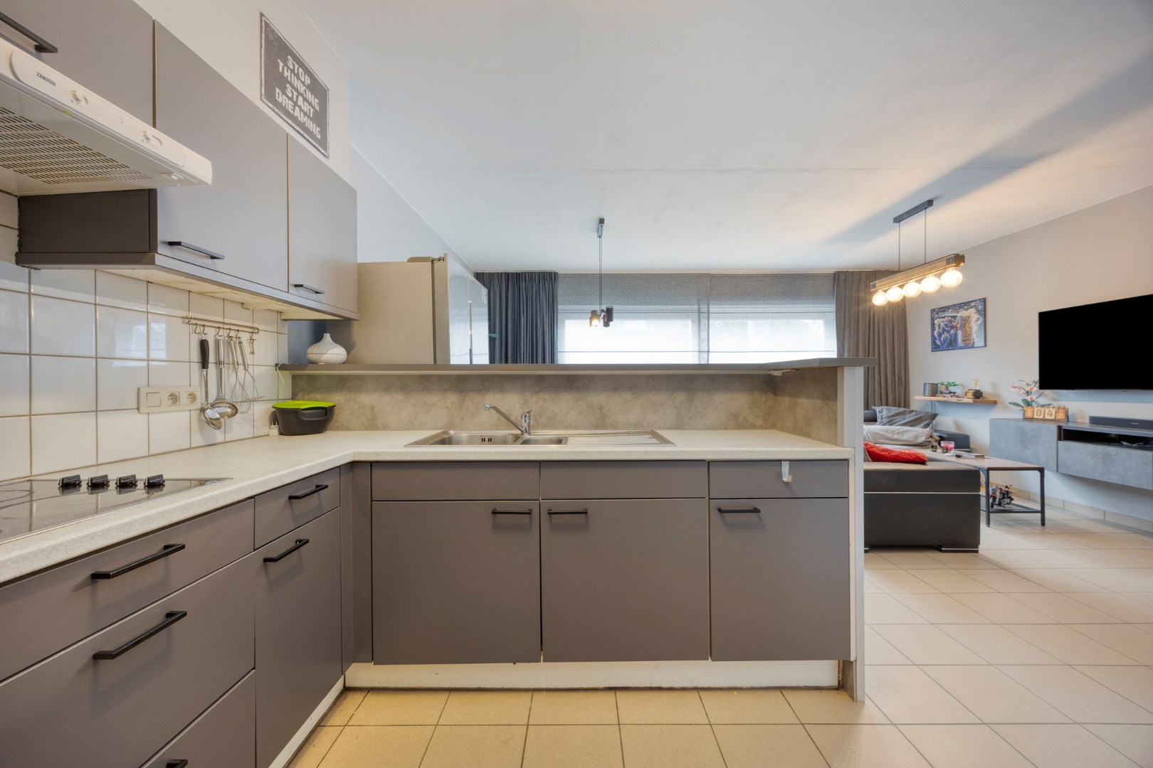 Bij binnenkomst via de inkomhal vindt u een apart gastentoilet en toegang tot de lichtrijke leefruimte. Aansluitend bevindt zich de ingerichte keuken met praktische berging. De leefruimte beschikt over een groot schuifraam dat uitgeeft op de zonnige, private tuin.