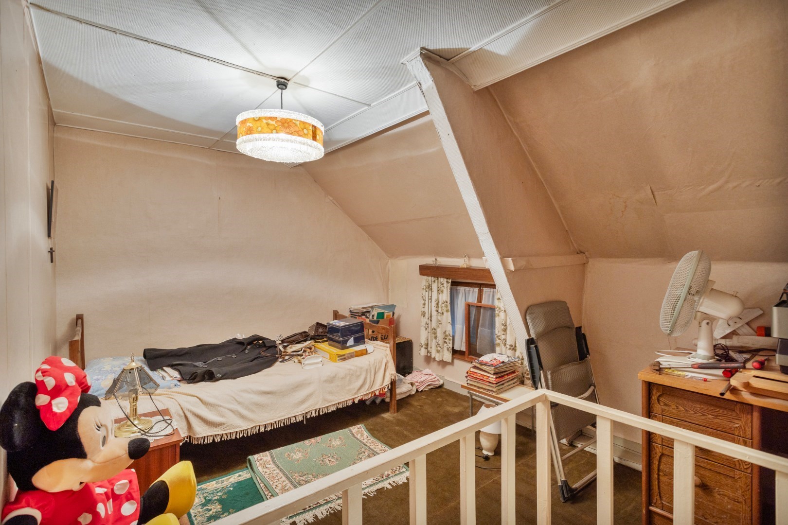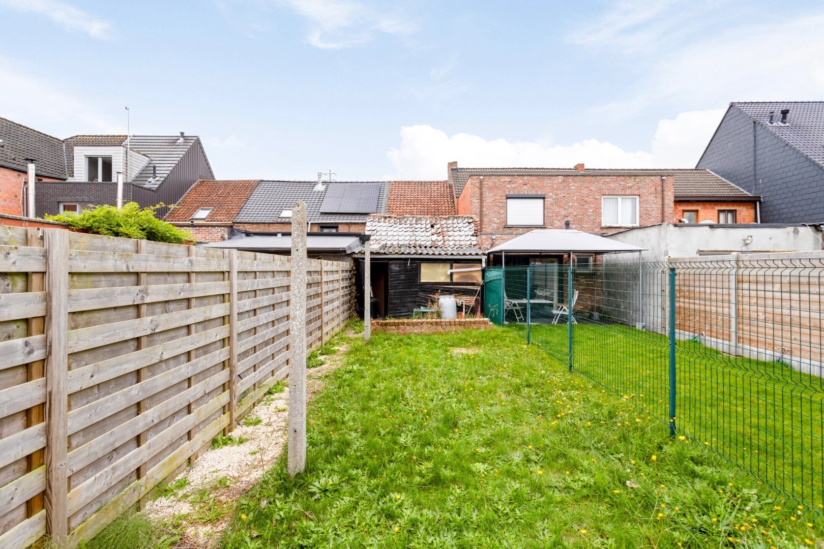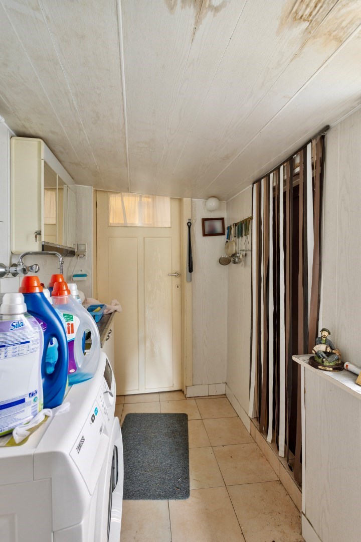 Via de leefruimte komen we terecht in de keuken. Deze geeft uit op een binnenkoer. Daarnaast hebben we een hal naar de achtertuin waar je de badkamer kan terugvinden en een technische bergruimte. Via de trap in deze hal kom je terecht op de 1ste verdieping, hier zijn er mogelijkheden tot het creëren van 2 afzonderlijke slaapkamers.