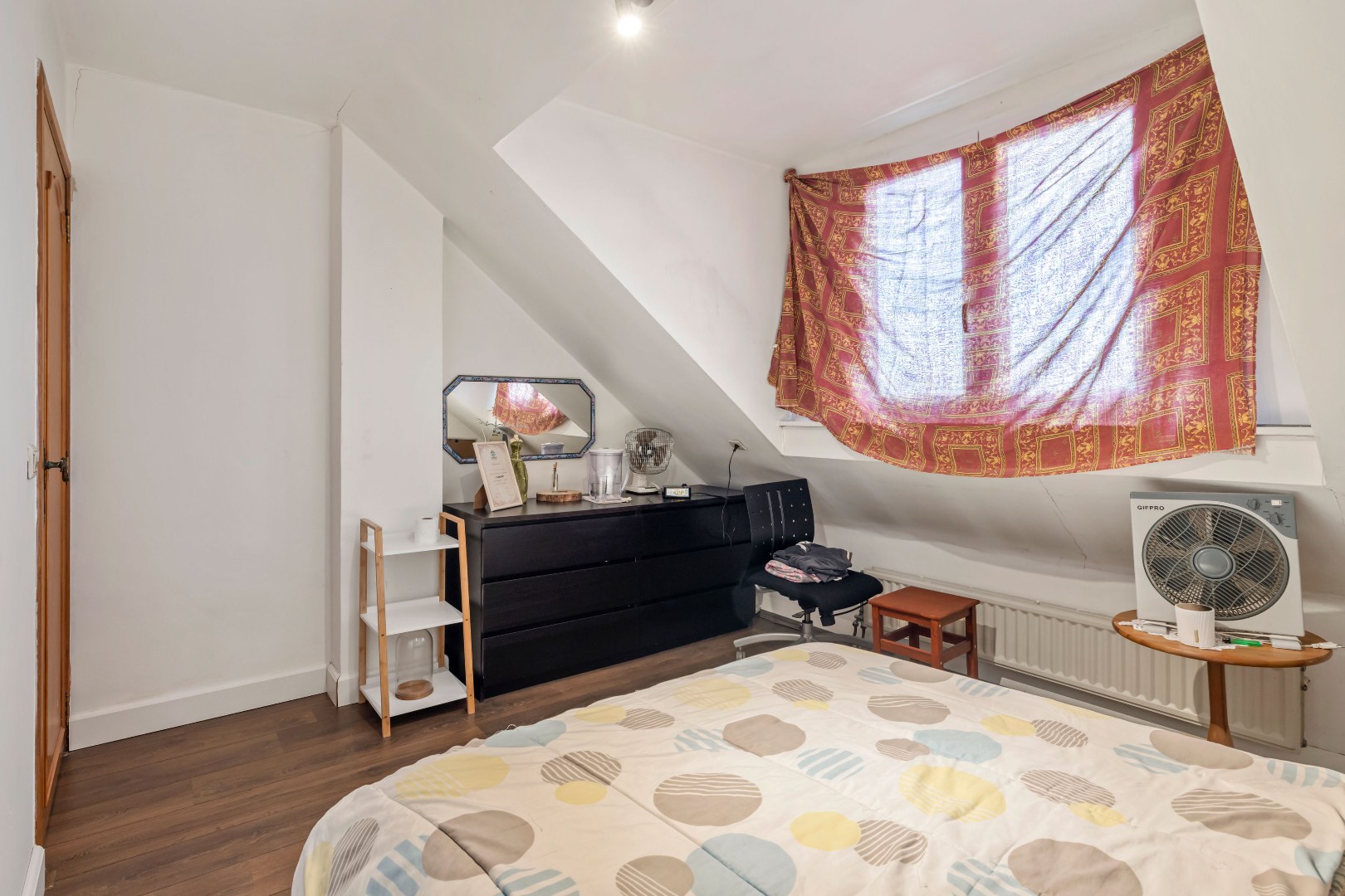 Op de eerste verdieping bevindt zich de badkamer met douche, bad, toilet en enkele wastafel en de tweede toilet alsook een ruime slaapkamer; Via de vaste trap komen we op de zolderverdieping met slaapkamers.