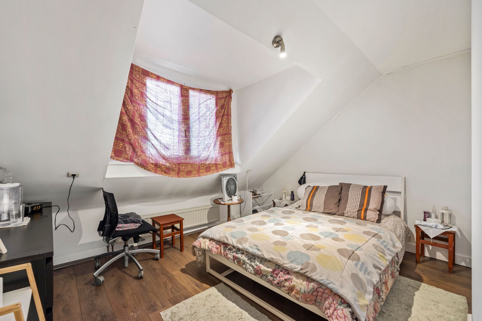 Op de eerste verdieping bevindt zich de badkamer met douche, bad, toilet en enkele wastafel en de tweede toilet alsook een ruime slaapkamer; Via de vaste trap komen we op de zolderverdieping met slaapkamers.