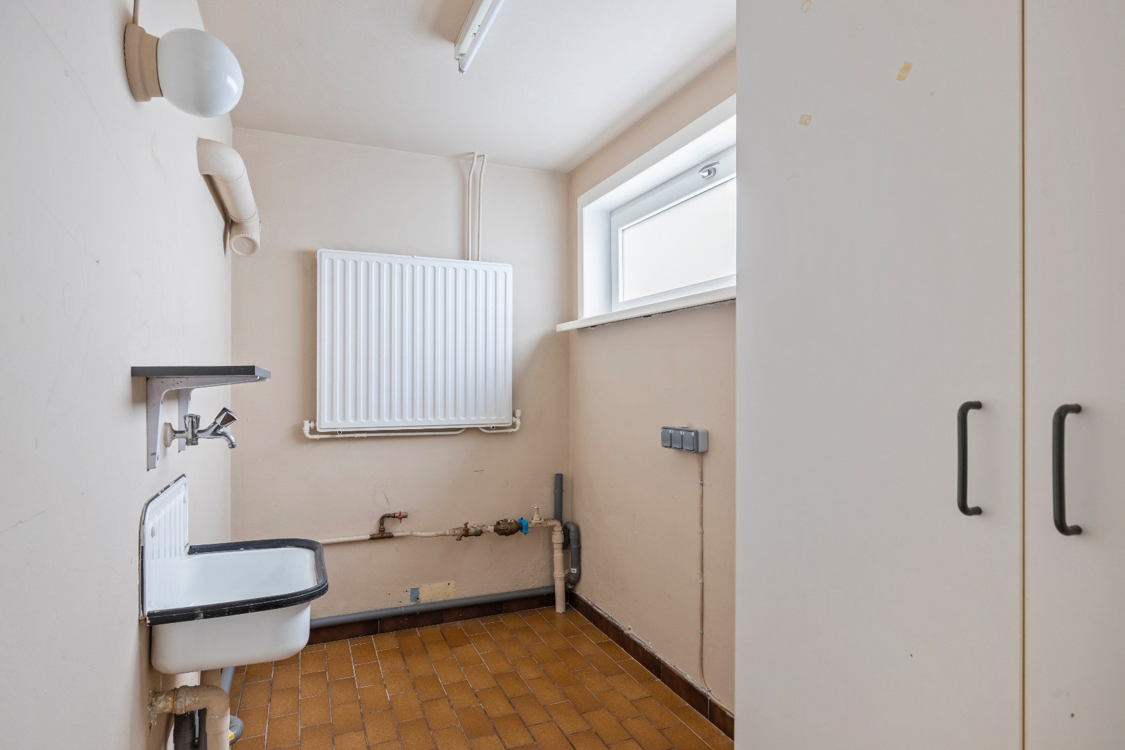 De keuken is volledig uitgerust met moderne toestellen en biedt plaats voor een ontbijthoek met uitzicht op het omliggende groen. Verder is er op het gelijkvloers een praktische berging en een gastentoilet aanwezig.