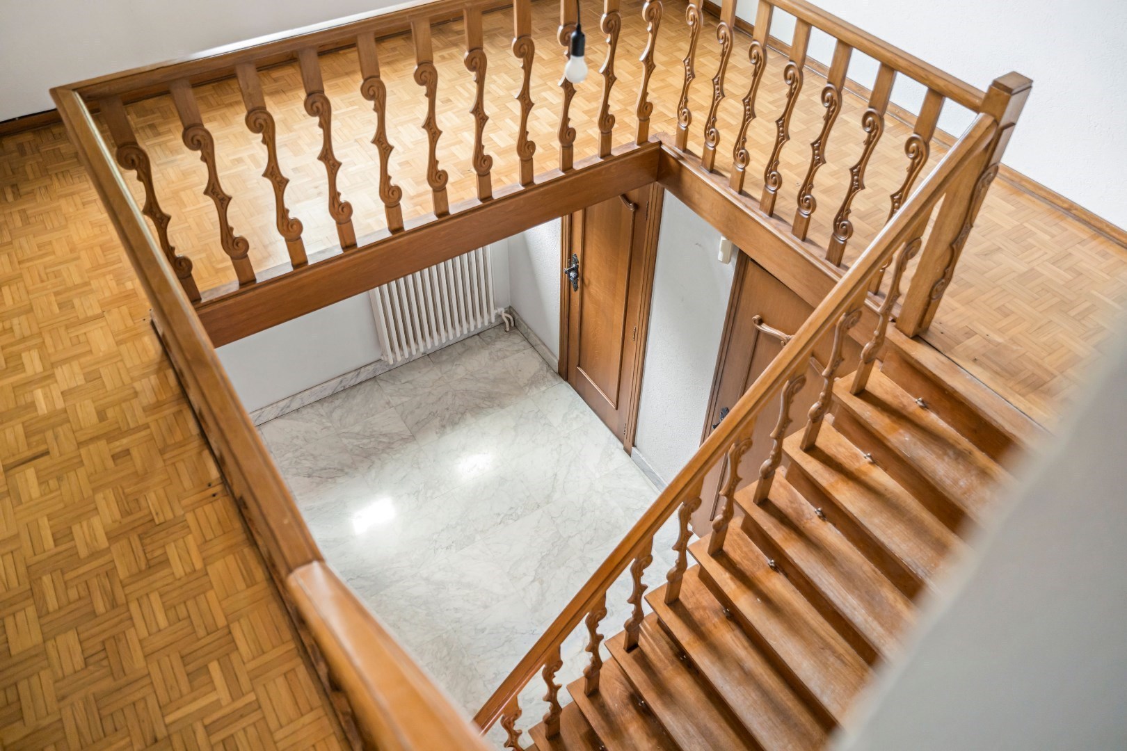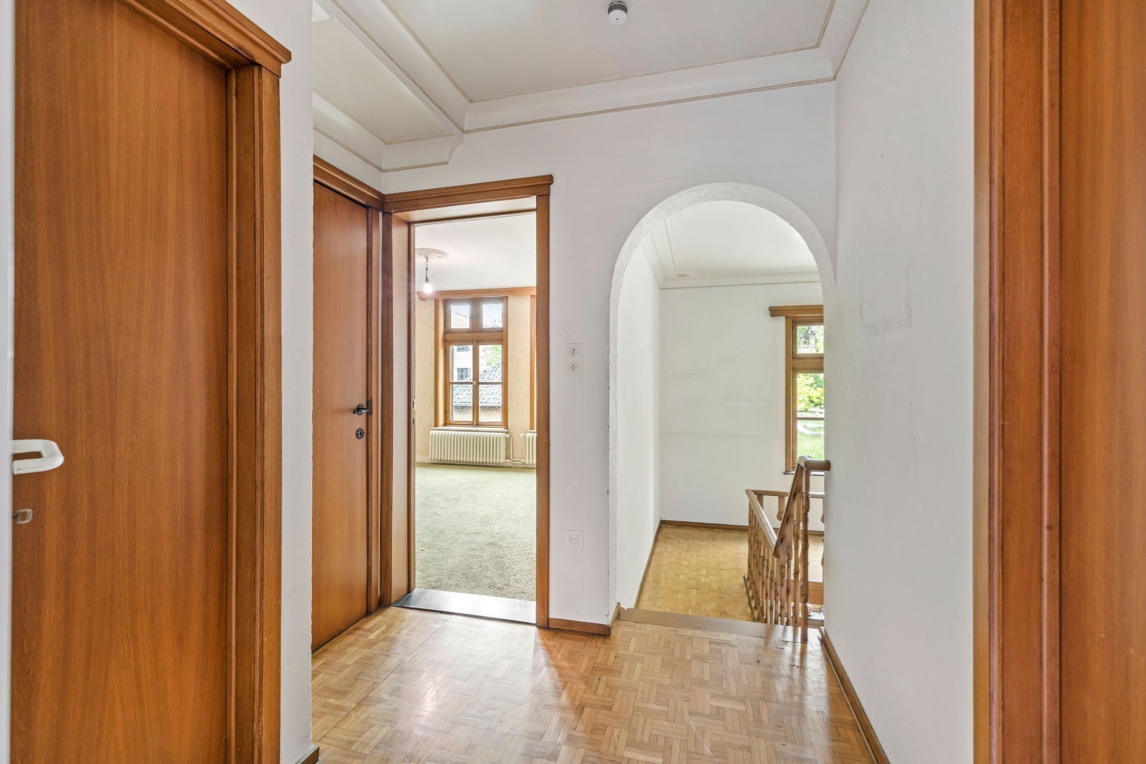 Je komt de woning binnen via een statige inkomhal met marmeren vloer, een gastentoilet/vestiaire en een authentieke eiken trap. De hal geeft je o.a. toegang tot een appart bureau gelegen aan de voorzijde van de woning.