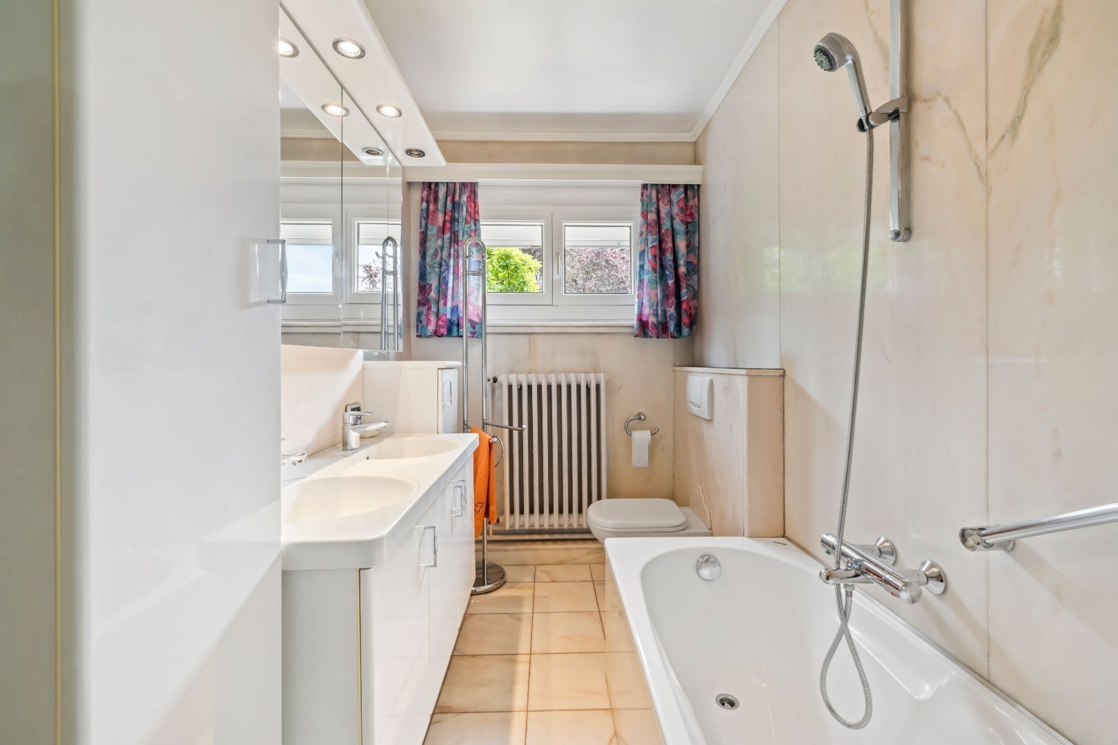 De leefruimte met connectie naar de tuin is royaal en badend in natuurlijk licht en heeft toegang tot de ruime volledig geïnstalleerde Siematic keuken (alle toestellen zijn vrij recent vernieuwd) met eethoek en een prachtig zicht op de tuin. Vanuit de keuken kan je naar de inpandige garage met toegang tot een ruime kelder.