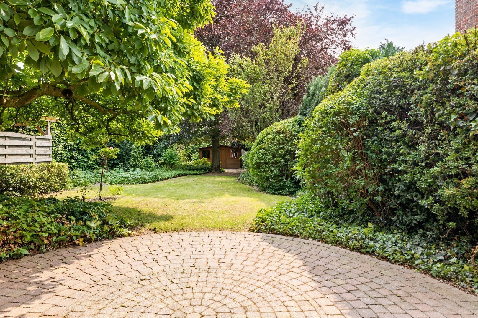 Mooi aangelegde tuin met prachtige beuk, zuid gericht terras en groot tuinhuis