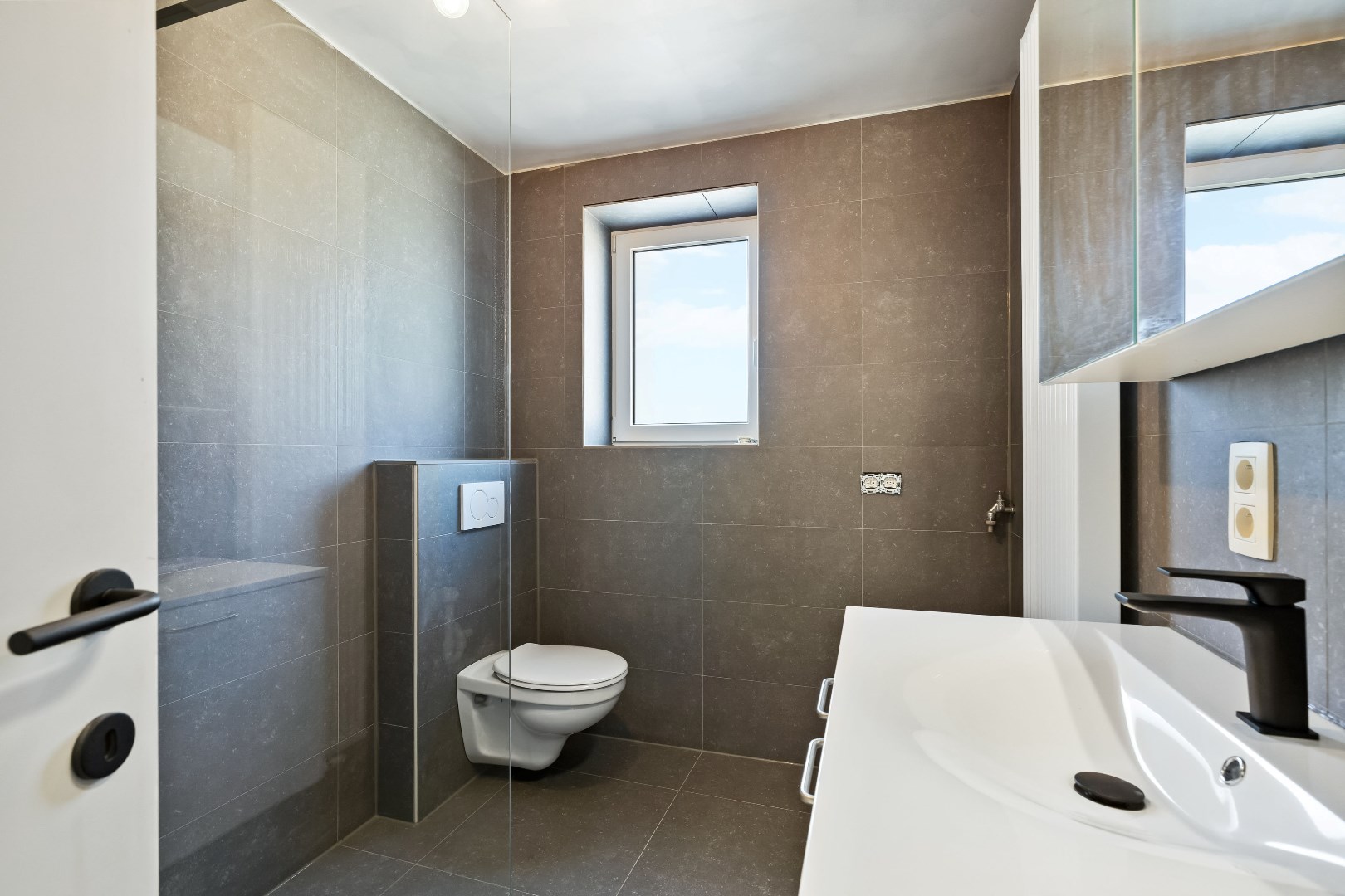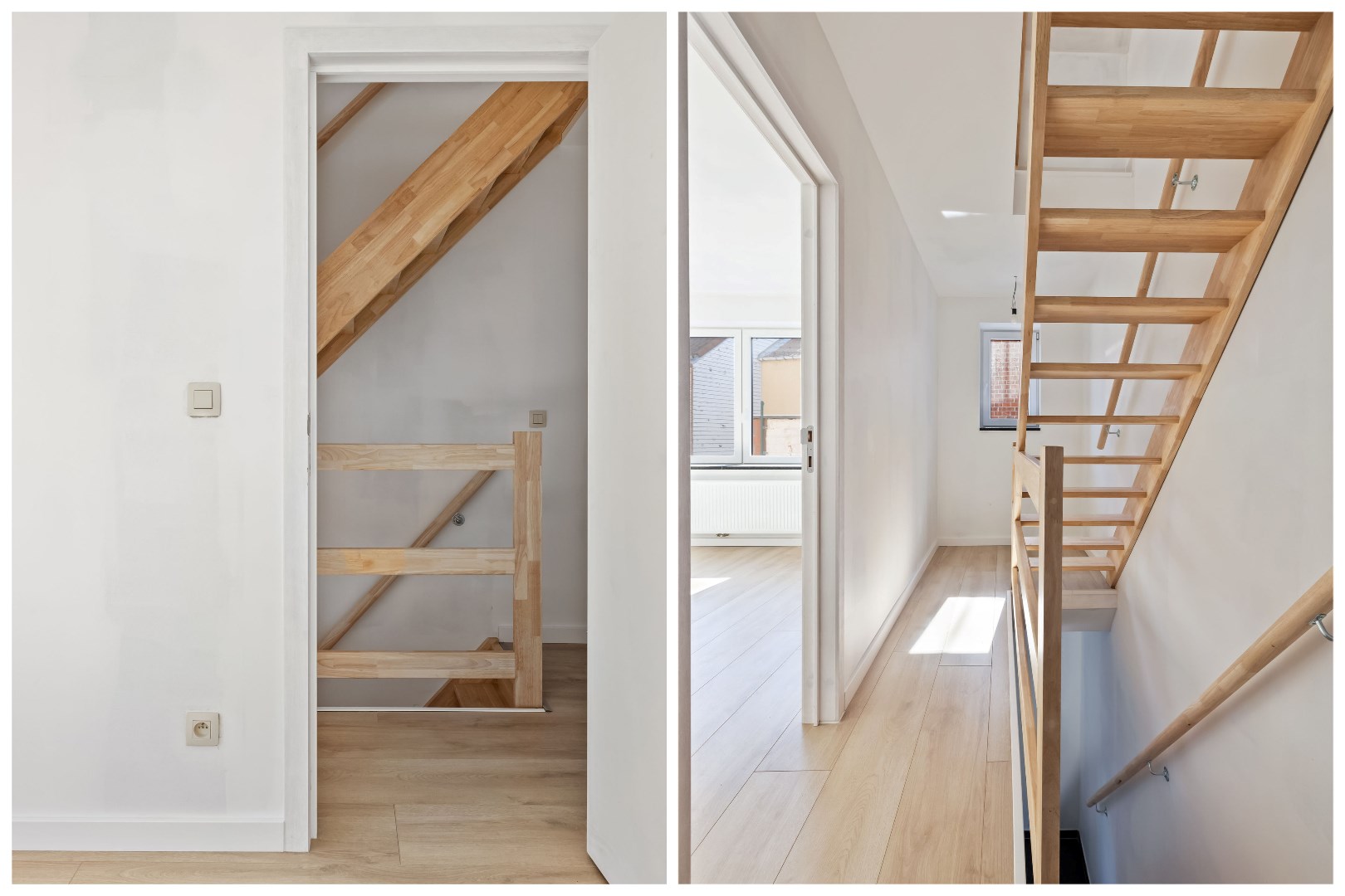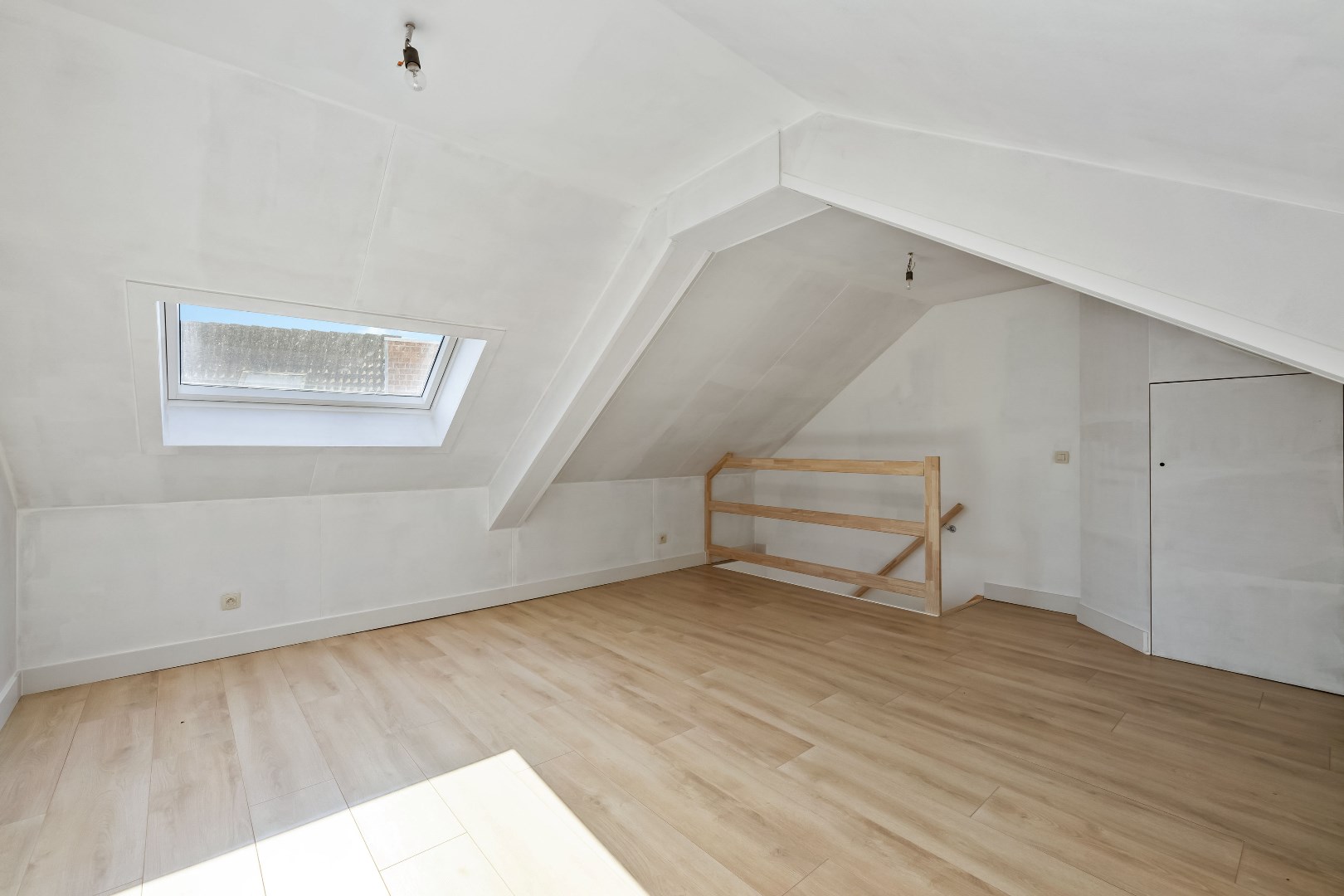 Op het gelijkvloers heeft de woning een aparte inkom met toilet, een ruime leefruimte met open keuken en een koertje. Op het verdiep hebben we 2 slaapkamers & de badkamer met douche, lavabo & toilet. Op het 2e verdiep vinden we nog een ruime zolderkamer.