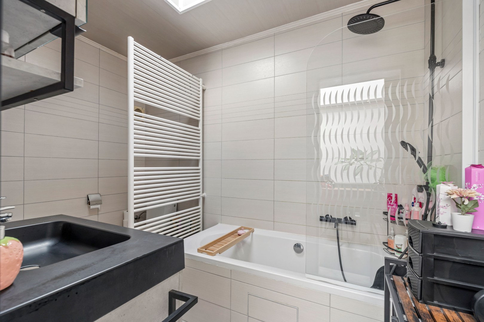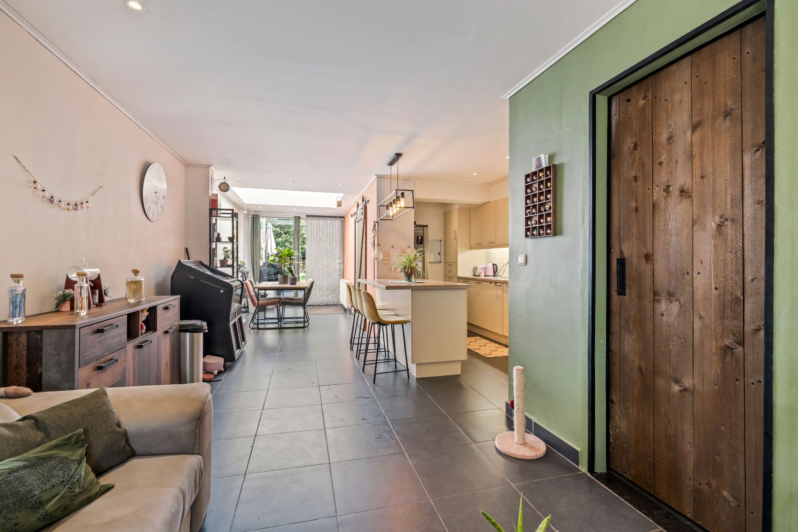 De lichtrijke leefruimte sluit aan op de open keuken, uitgerust met alle nodige toestellen: vaatwasser, spoelbak, koelkast en oven. De badkamer is praktisch ingericht met zowel een ligbad als een douche.