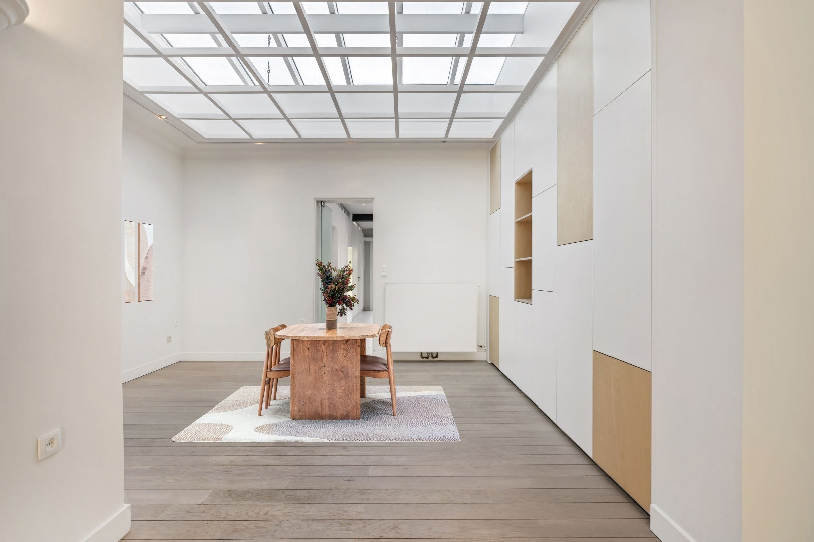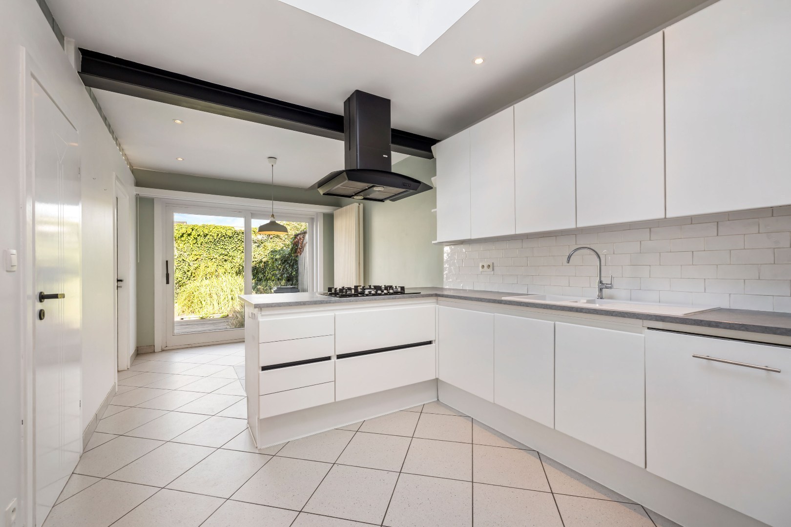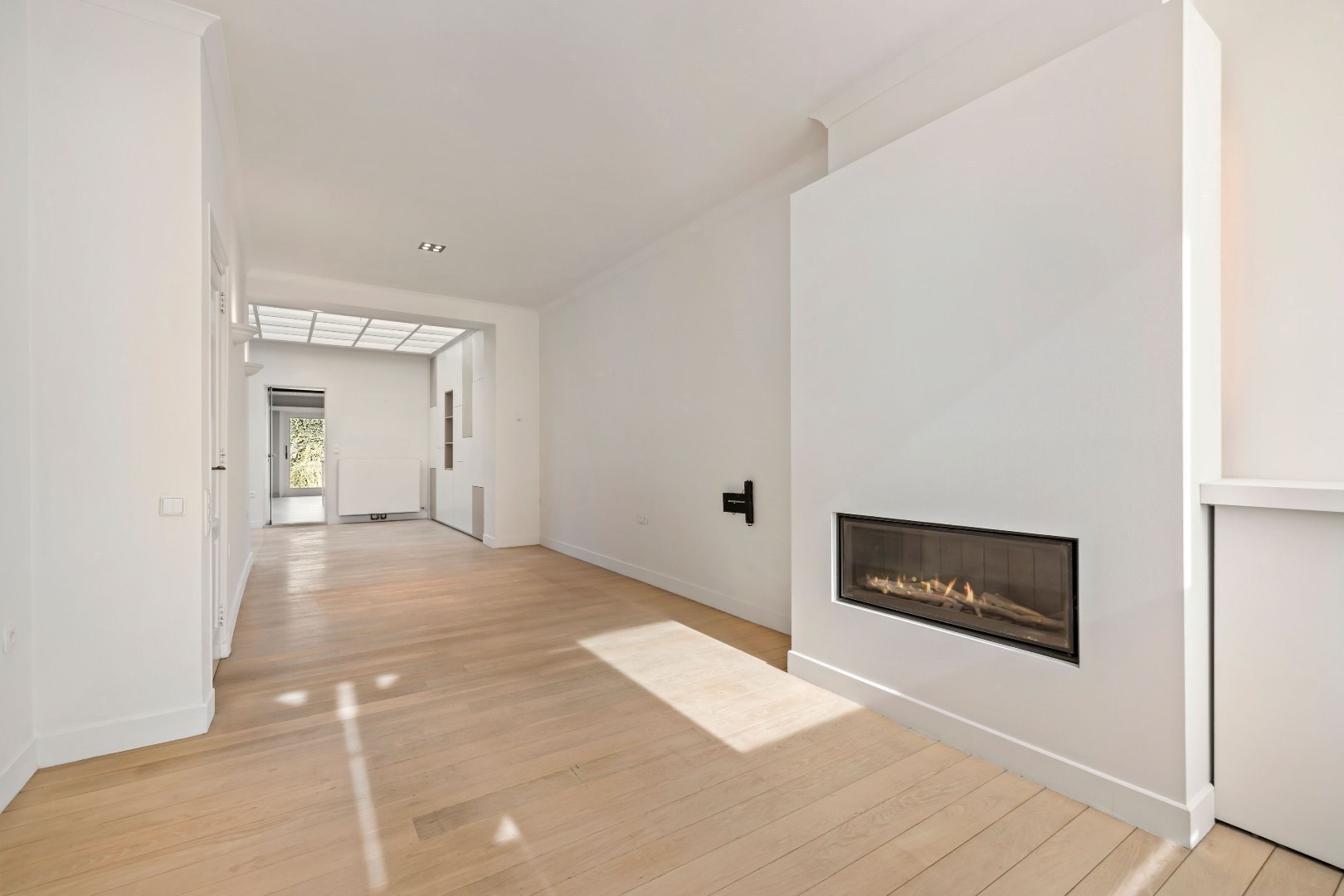 De leefruimte ademt warmte dankzij de knappe parket en de gezellige gashaard. Aansluitend bevindt zich een open keuken met zicht op de stadstuin – een ideale plek om te genieten van rust in de stad.