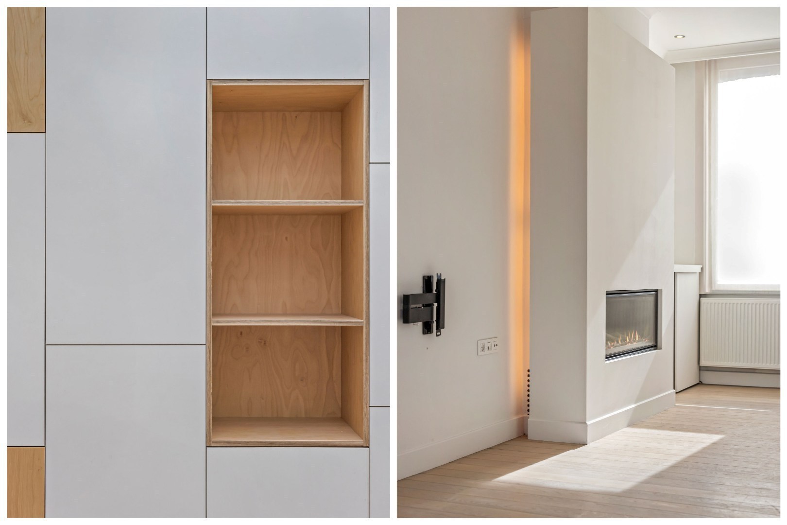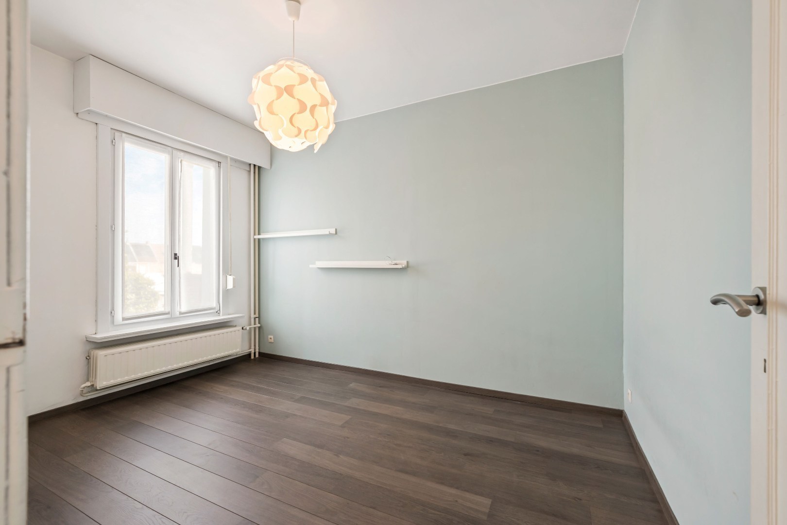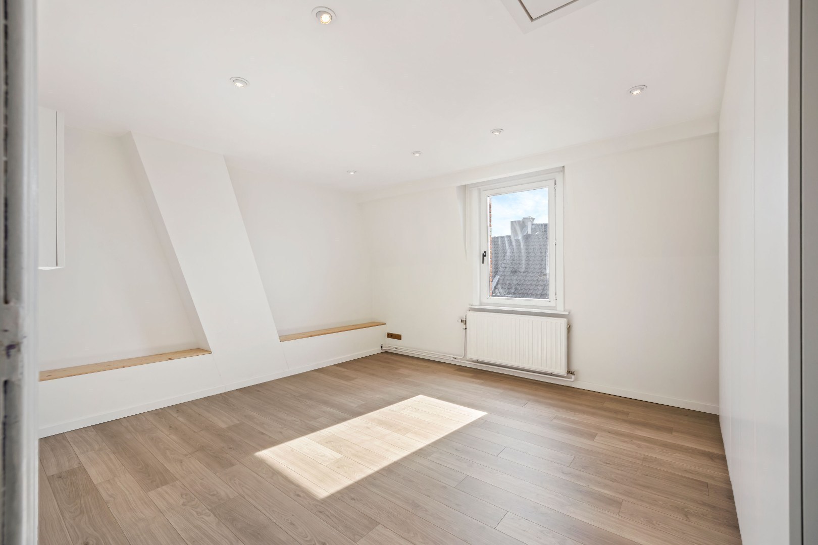 De leefruimte ademt warmte dankzij de knappe parket en de gezellige gashaard. Aansluitend bevindt zich een open keuken met zicht op de stadstuin – een ideale plek om te genieten van rust in de stad.