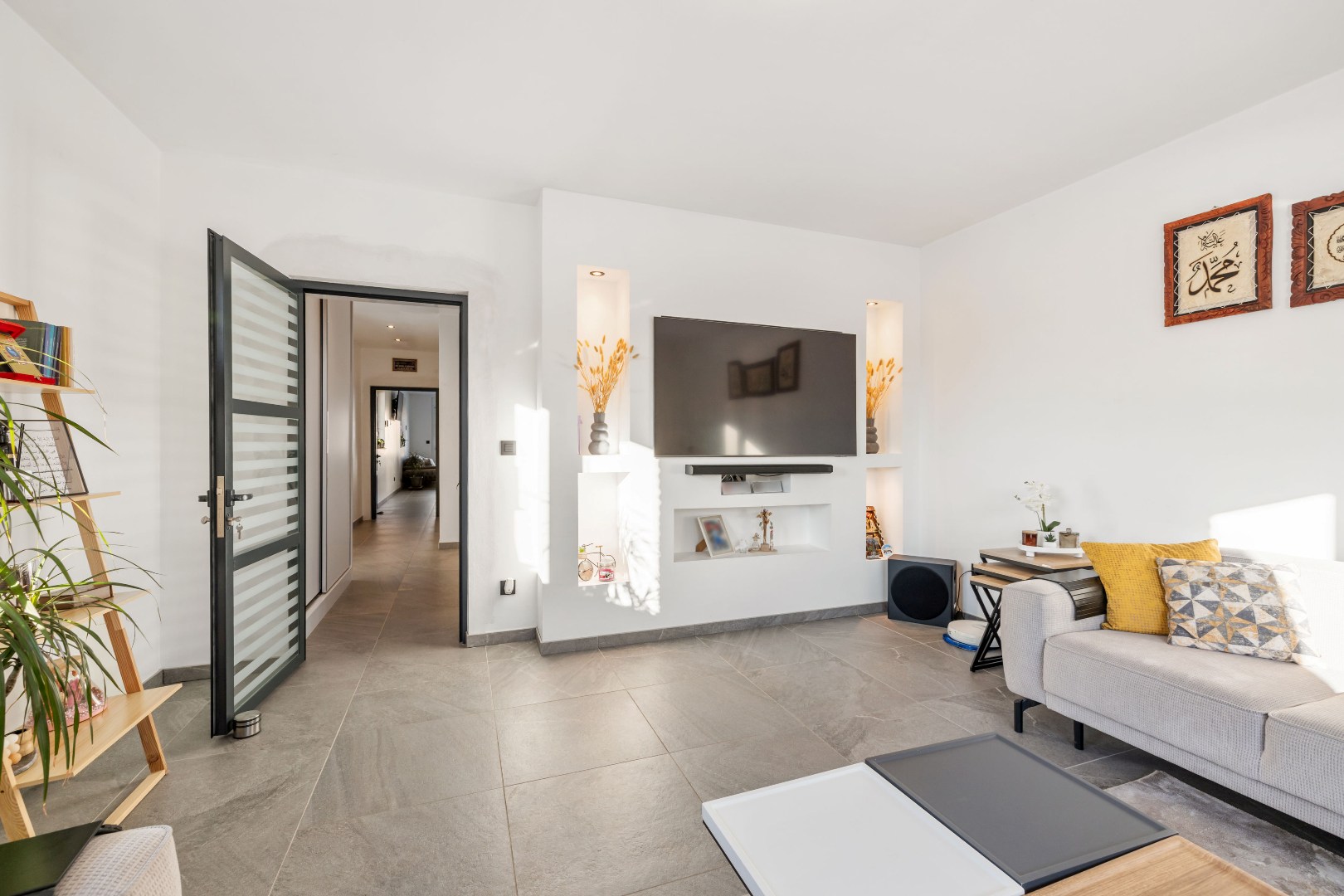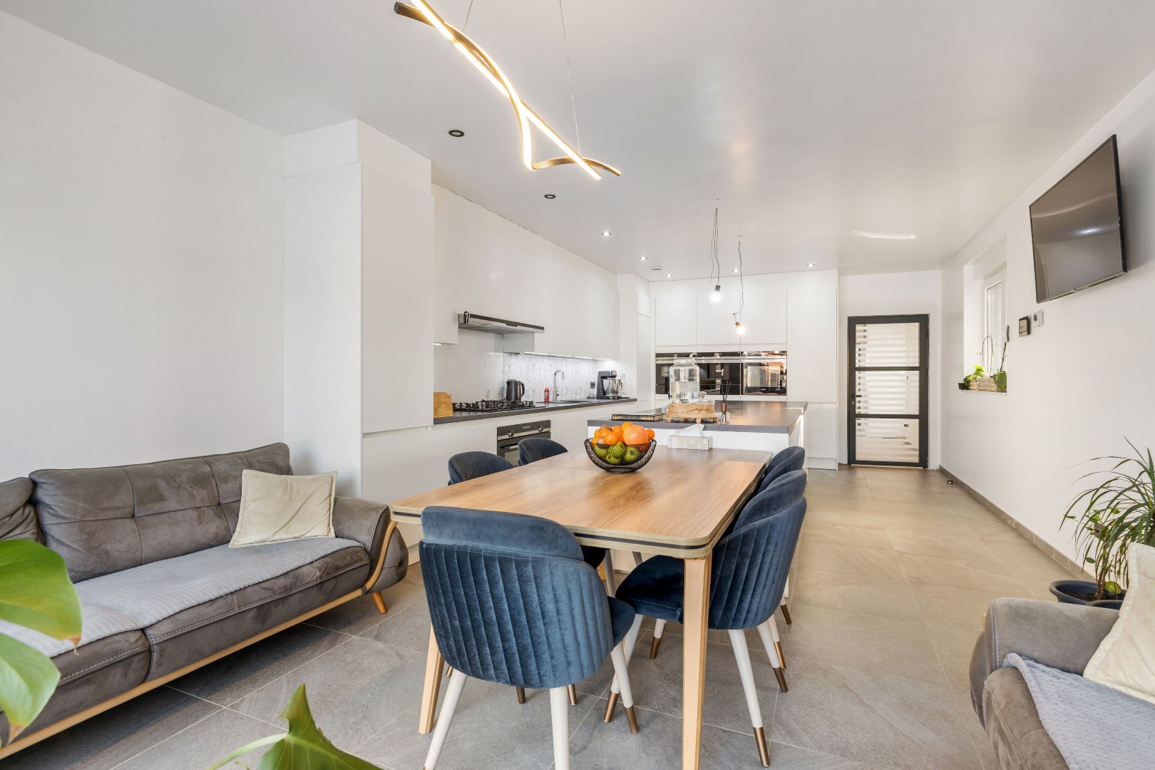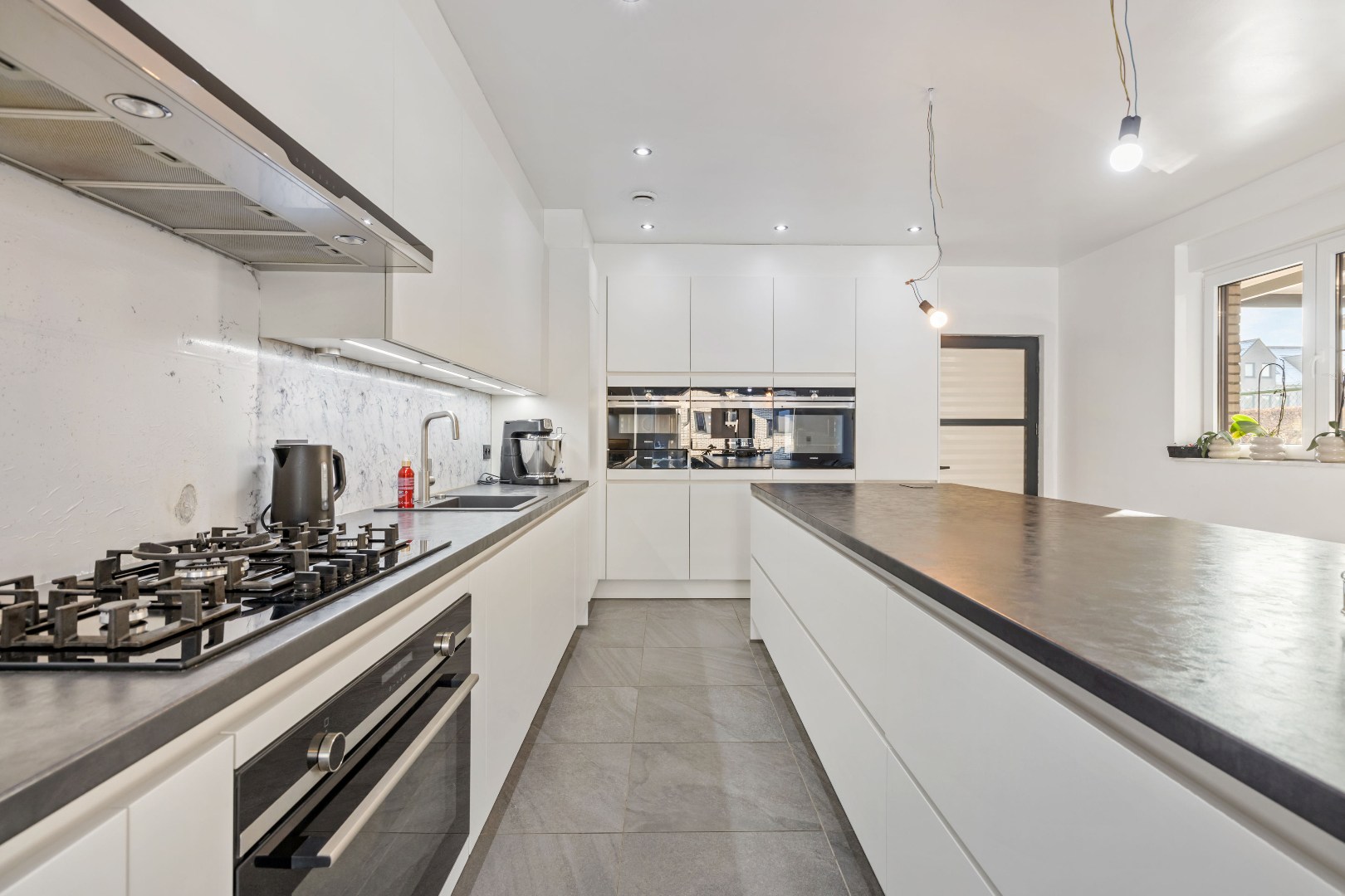 Binnenin vindt u een zeer ruime leefruimte aan de voorzijde, een luxueuze keuken met dubbele oven, ingebouwde koffiemachine en gasvuur – ideaal voor wie graag kookt. De woning telt vier volwaardige slaapkamers en een badkamer met douche en verwarmde vloer. Elk raam is uitgerust met elektrische rolluiken.