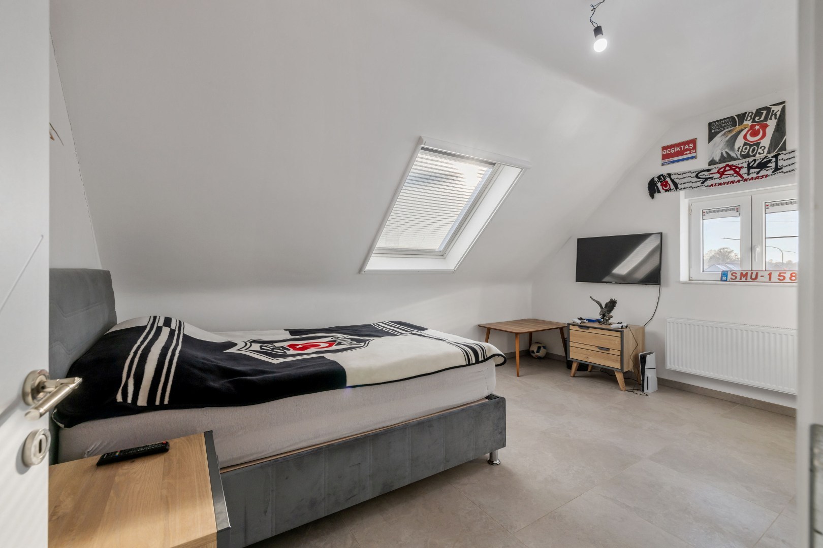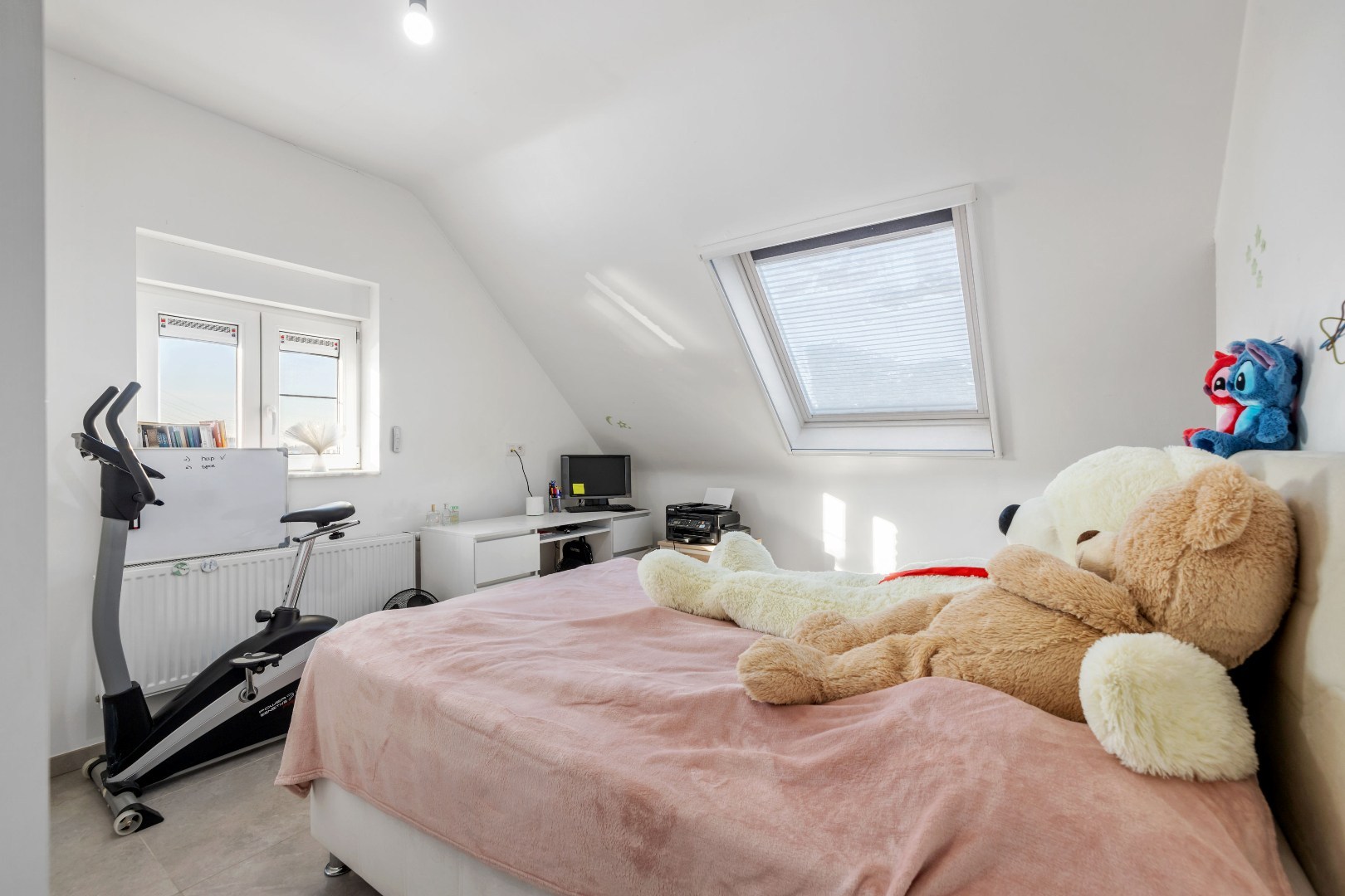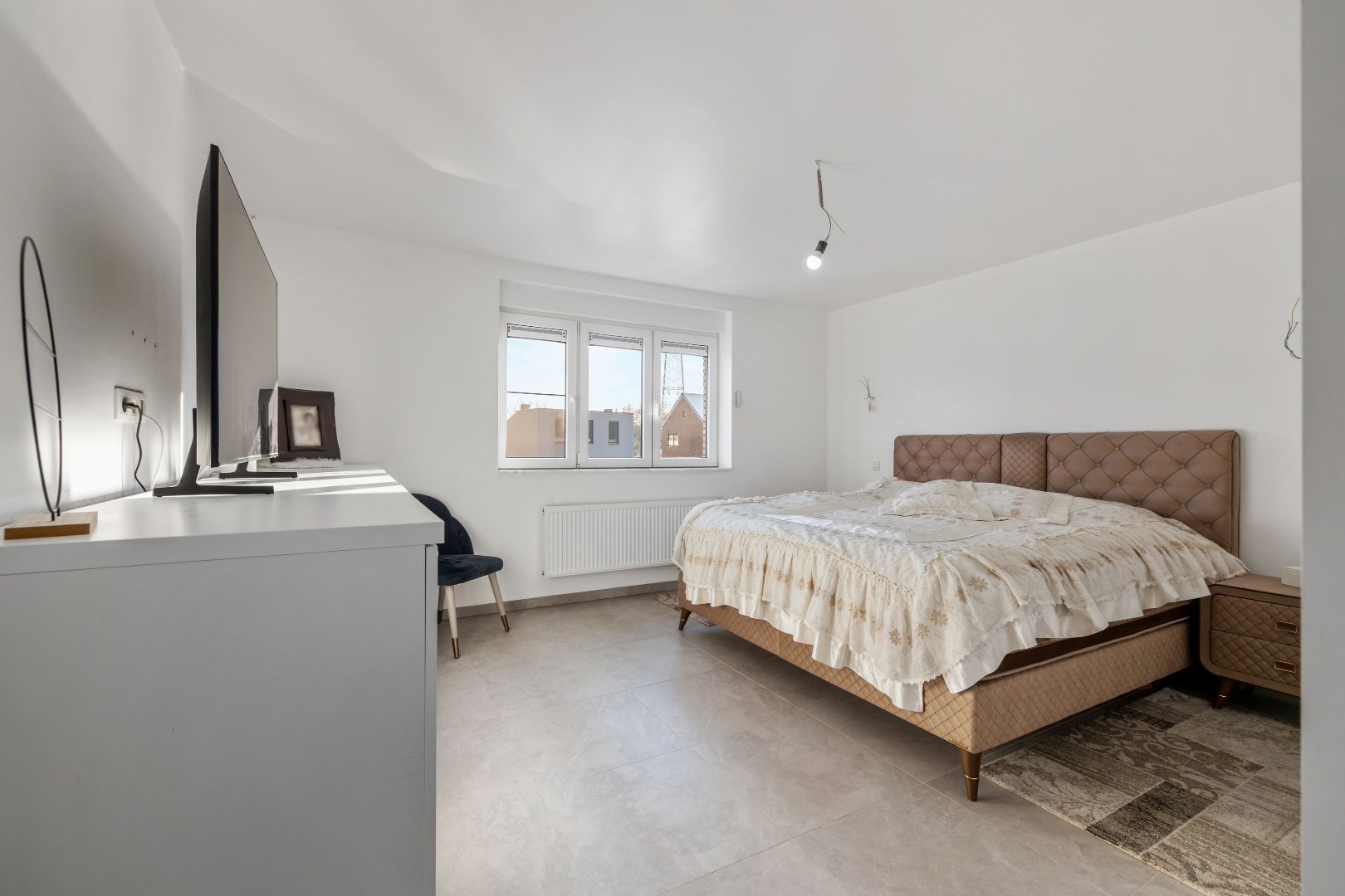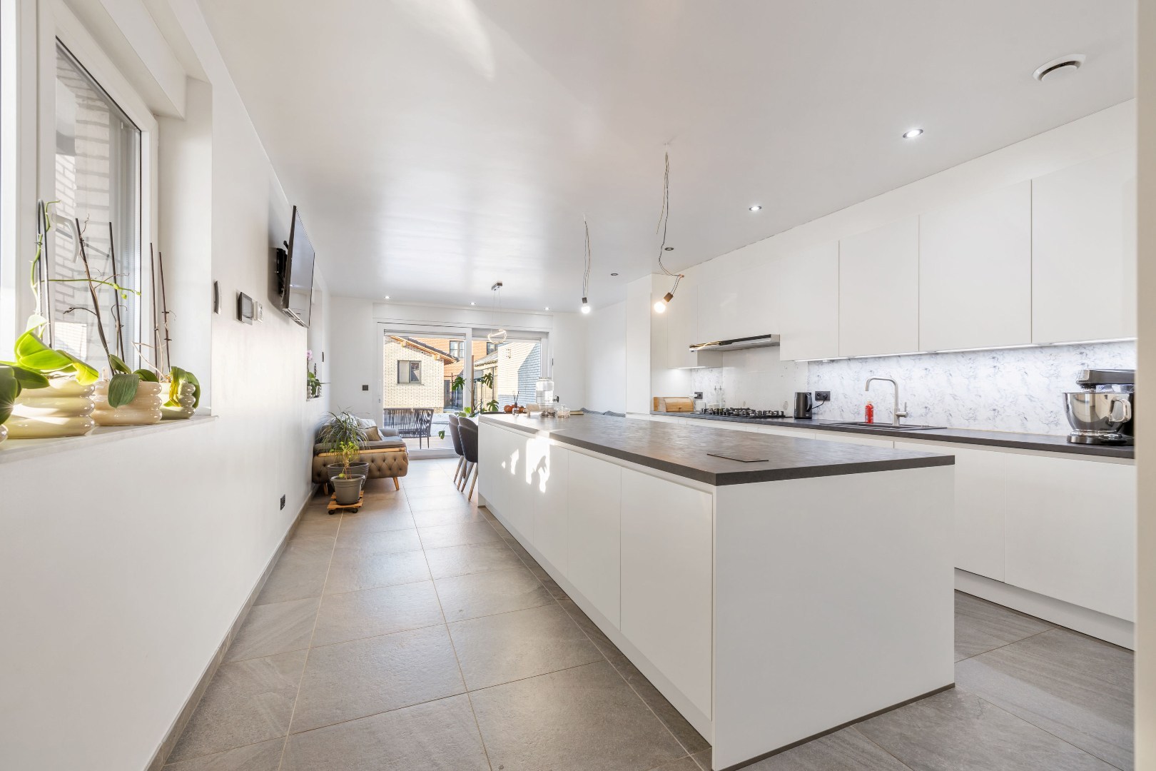 Binnenin vindt u een zeer ruime leefruimte aan de voorzijde, een luxueuze keuken met dubbele oven, ingebouwde koffiemachine en gasvuur – ideaal voor wie graag kookt. De woning telt vier volwaardige slaapkamers en een badkamer met douche en verwarmde vloer. Elk raam is uitgerust met elektrische rolluiken.