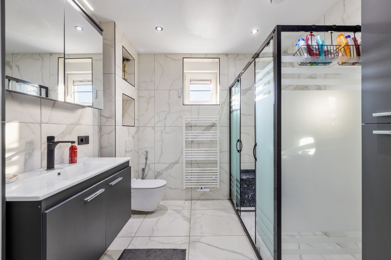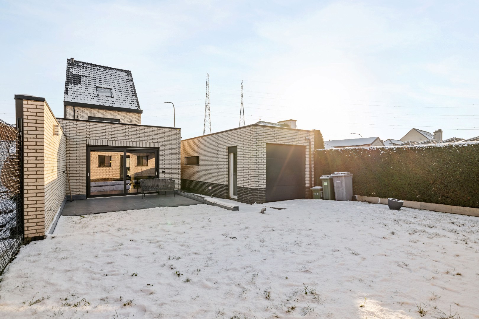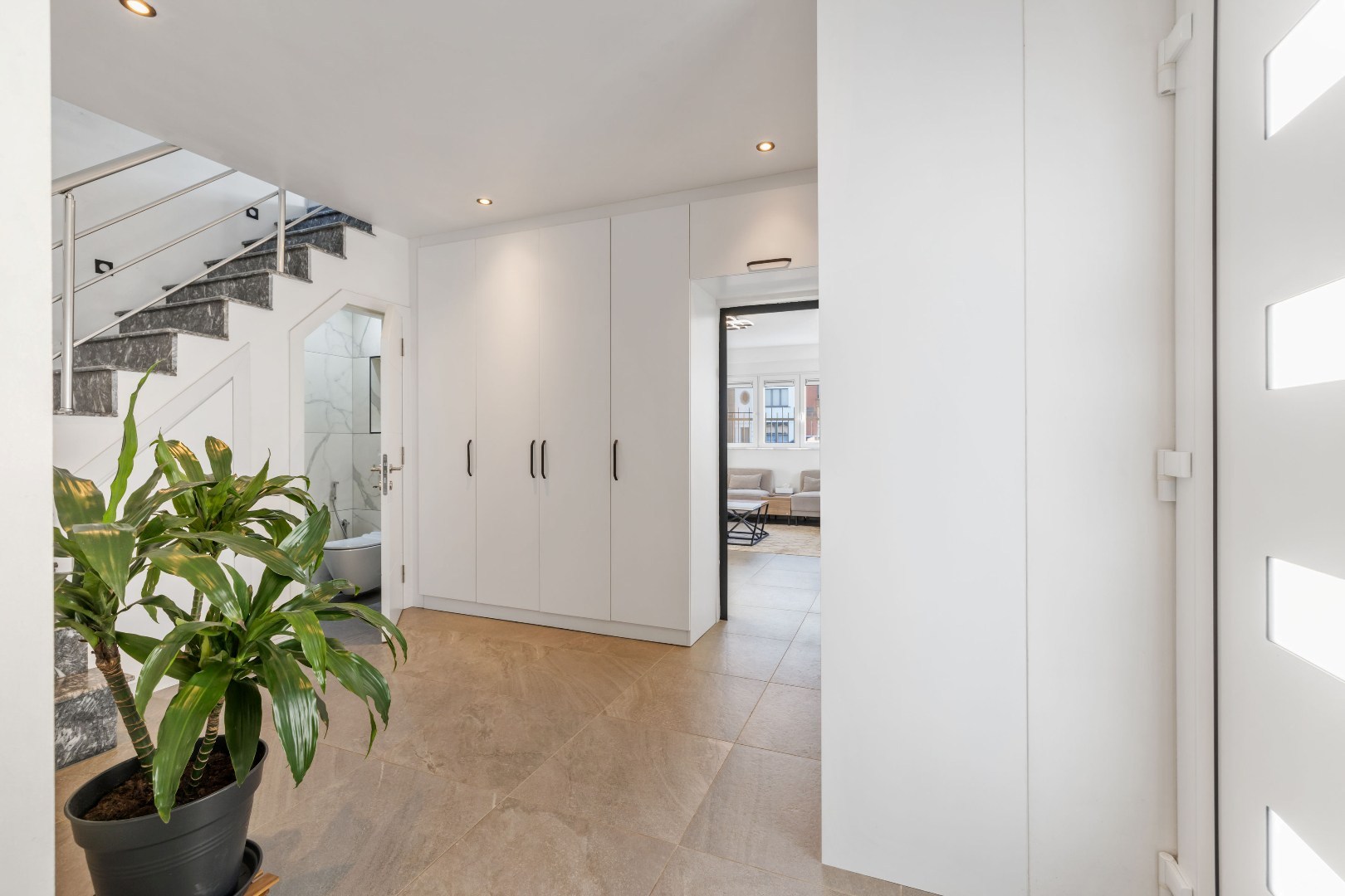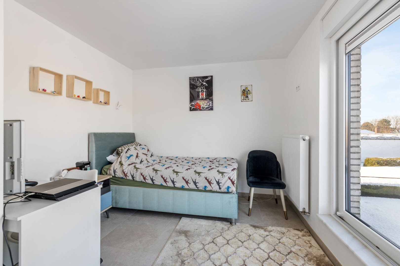 Binnenin vindt u een zeer ruime leefruimte aan de voorzijde, een luxueuze keuken met dubbele oven, ingebouwde koffiemachine en gasvuur – ideaal voor wie graag kookt. De woning telt vier volwaardige slaapkamers en een badkamer met douche en verwarmde vloer. Elk raam is uitgerust met elektrische rolluiken.