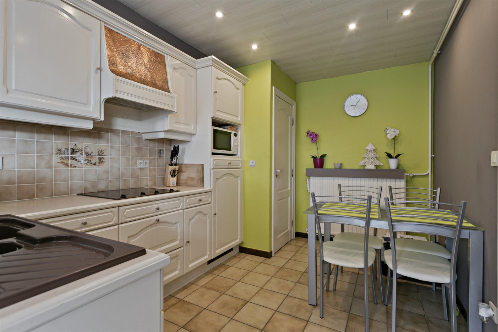 We komen binnen in de ruime inkomhal die toegang verleent tot de leefruimte, het toilet en de eerst verdieping. Deze leefruimte (32m2) geeft toegang tot de veranda en de keuken (11m2) die is geïnstalleerd en voorzien van dubbele spoelbak, warme luchtoven, elektrisch vuur, ijskast en dampkap. Naast de keuken vinden we een aparte opslagruimte.