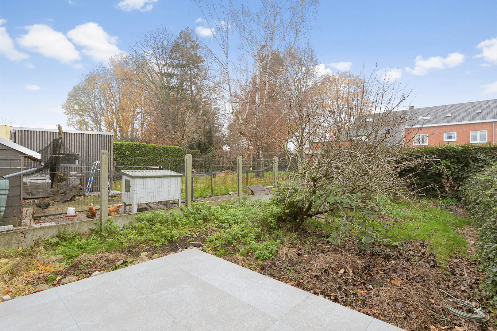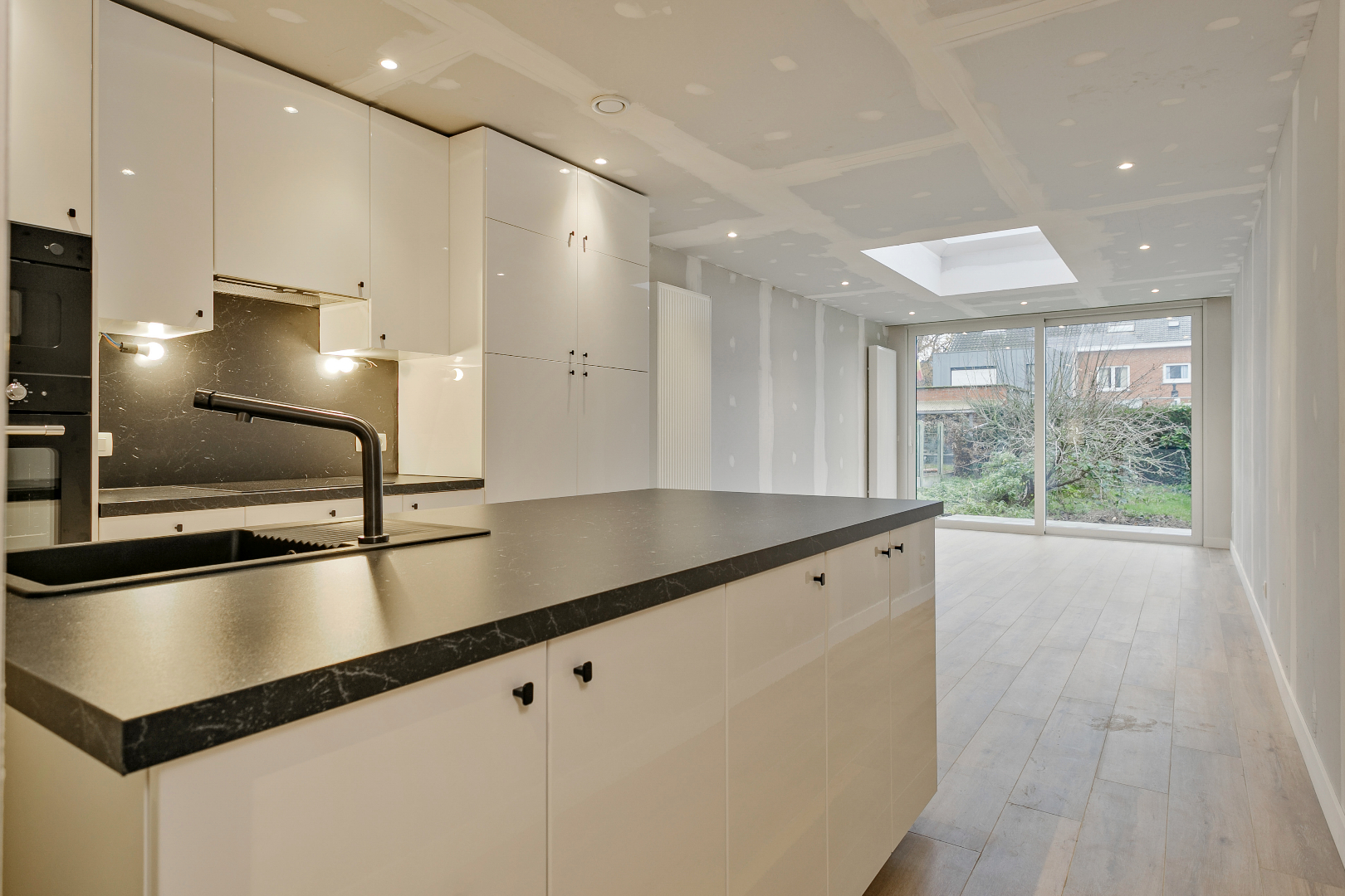 Je komt binnen via de inkomhal met garage waar de nieuwe condensatieketel staat en het ventilatiesysteem. Je komt binnen in de keuken met eiland die mooi aansluit aan de leefruimte met gigantisch schuifraam die uitkijkt op het aangelegde terras met tuin.