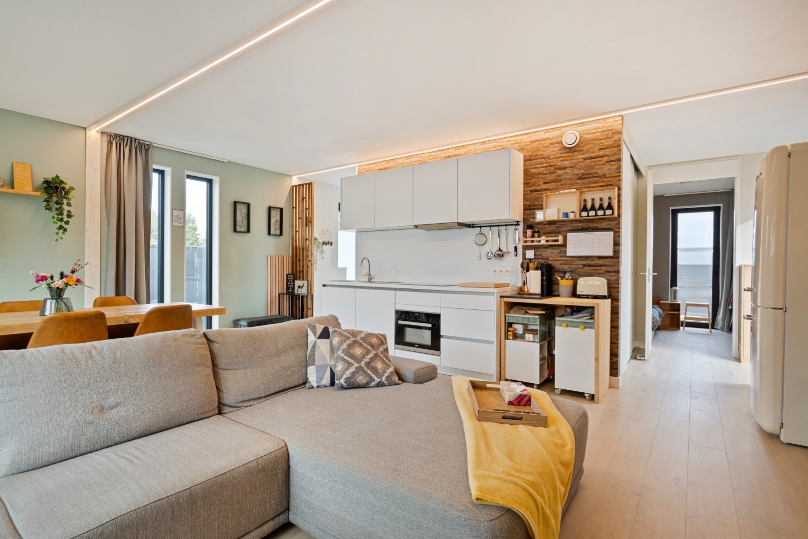 We komen binnen in de aparte inkomhal die ons naar de open leefruimte brengt, deze gezellige leefruimte staat in rechtstreeks contact met de keuken die is geïnstalleerd met inductie kookvuur, dubbele spoelbak, combi oven en dampkap. Naast de keuken bevindt zich een ruime berging.