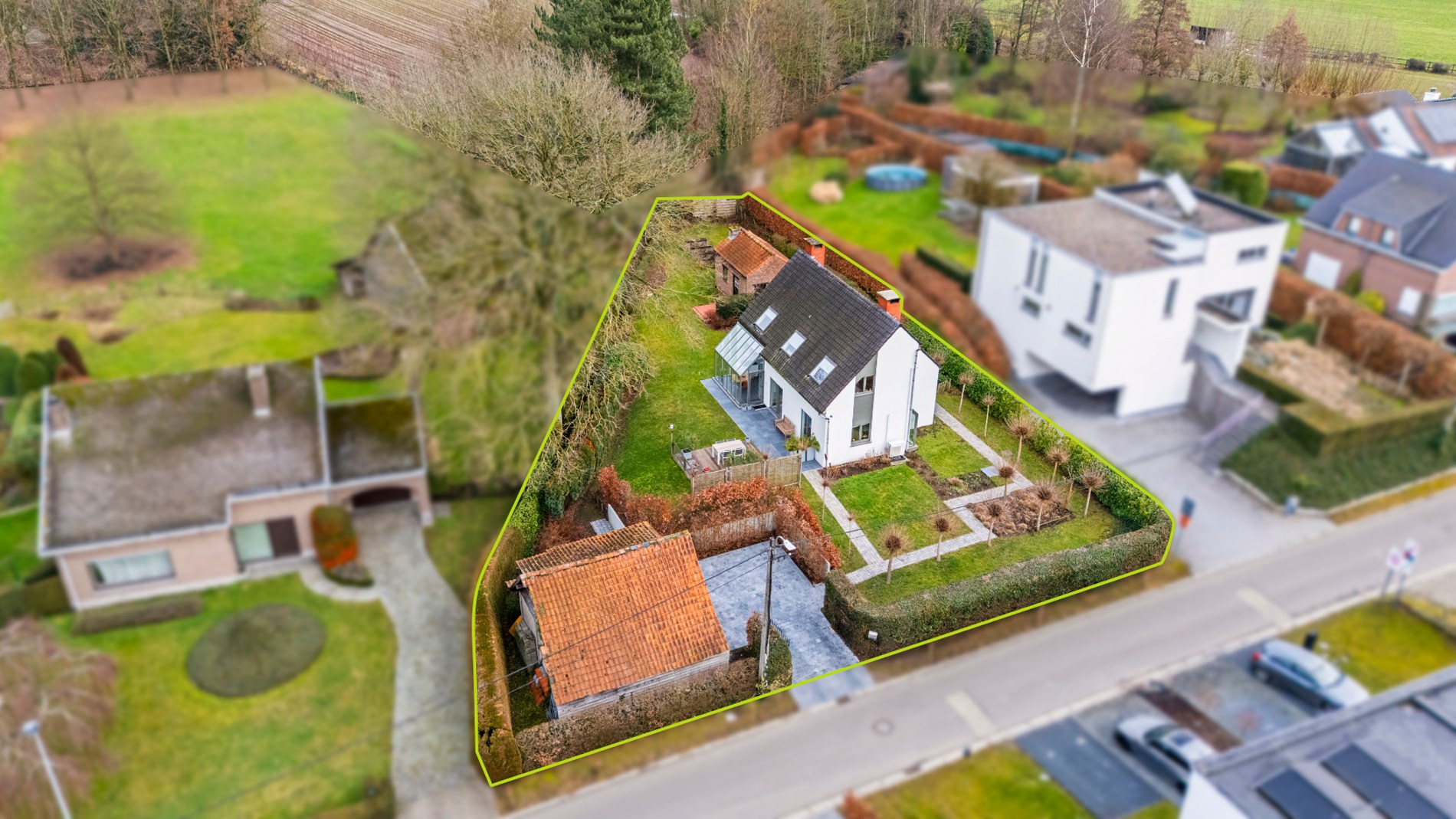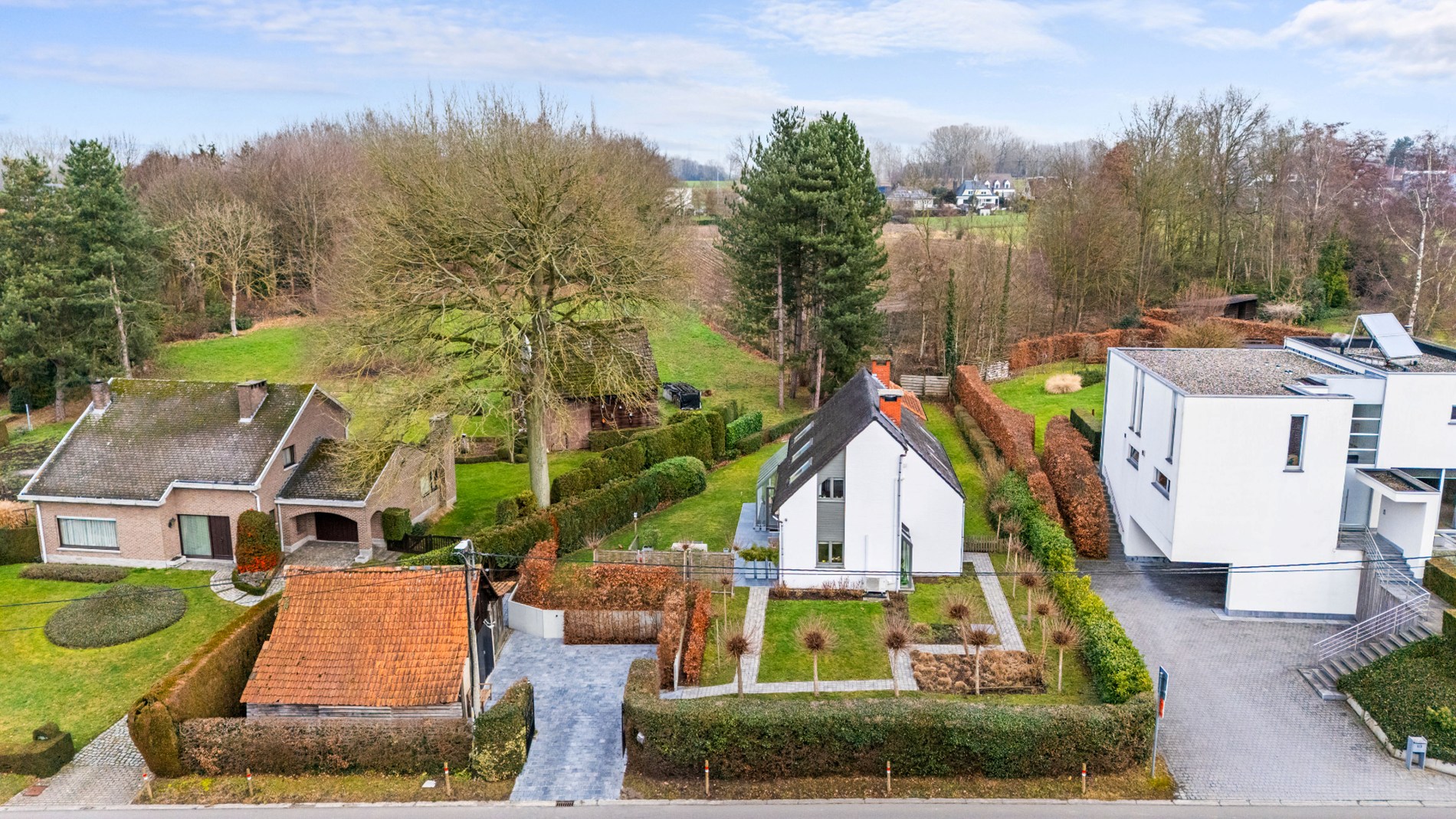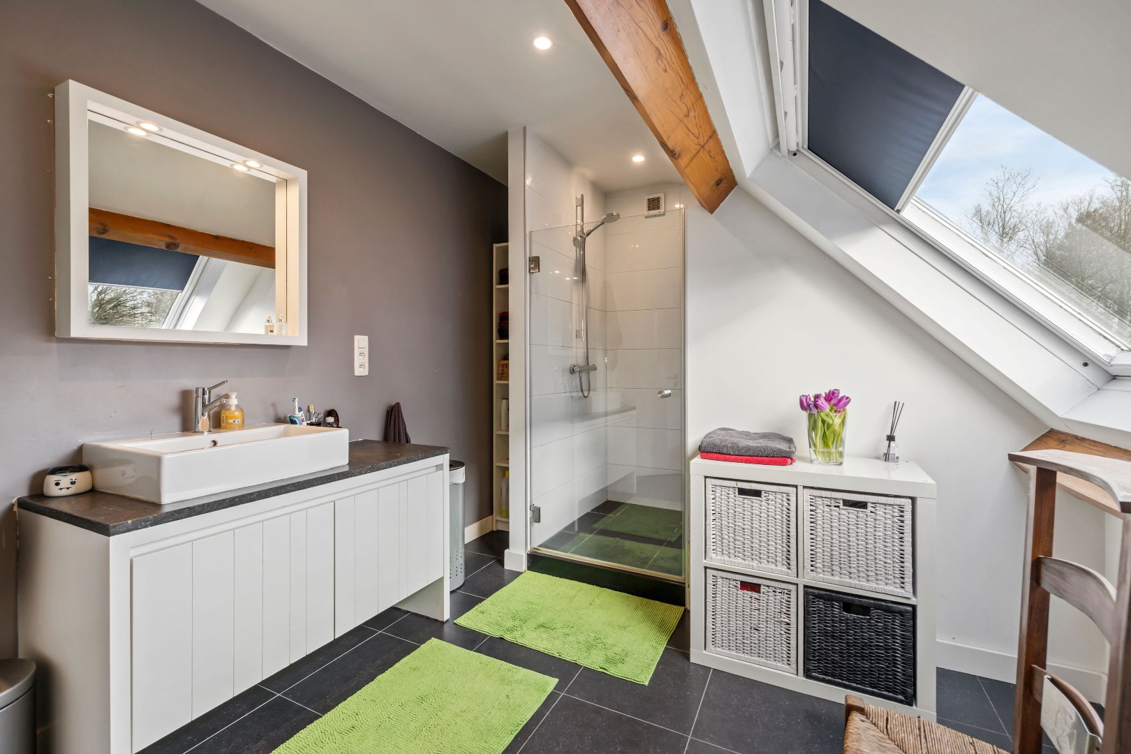 Op het verdiep bevinden zich drie ruime slaapkamers en een moderne badkamer met inloopdouche. De woning is verder uitgerust met twee toiletten, voldoende opbergruimte, een oprit en hedendaags comfort zoals vloerverwarming, een condensatieketel, dubbele beglazing en een sfeervolle houtkachel.