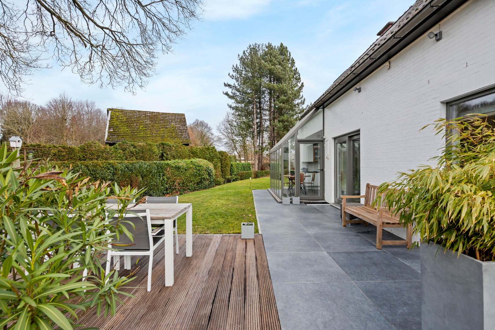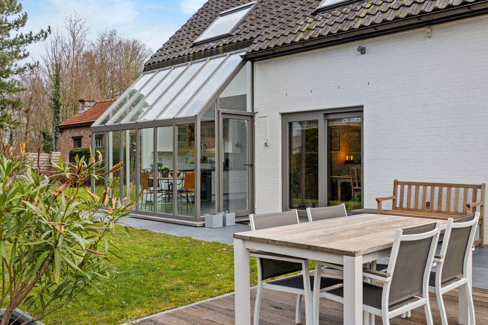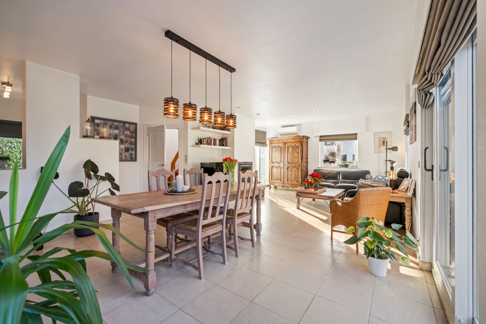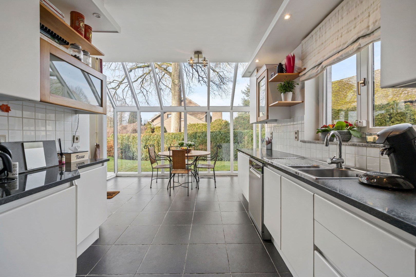 De gezellige leefruimte baadt in het licht dankzij de overvloedige zoninval en sluit mooi aan op de leefkeuken die het hart vormt van de woning en beschikt over een bijzonder aangename ontbijthoek met prachtig zicht op het verzorgde tuin.