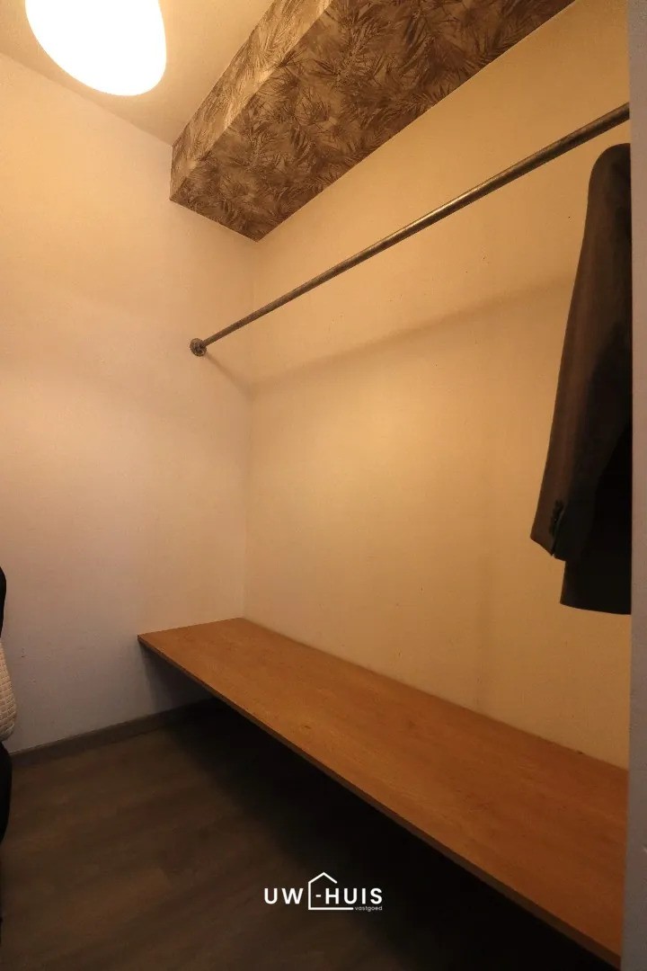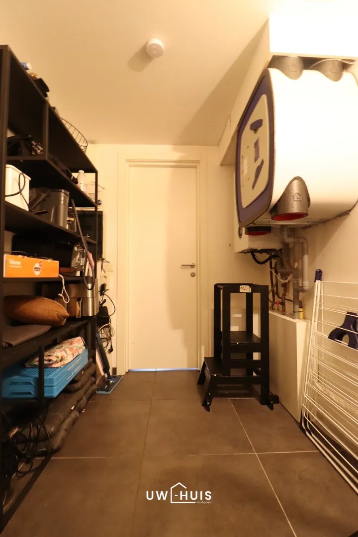 Inkomhal met ingemaakte kasten en een gastentoilet. Ruime én lichtrijke leefruimte met open keuken. De keuken is volledig geïnstalleerd met kasten en toestellen. Ruime berging met aansluiting voor het wasmachine en de droogkast. Er is voldoende opbergruimte in de berging. Badkamer met ligbad, douche, dubbel lavabomeubel én toilet. Twee slaapkamers waarvan één slaapkamer met inloopdressing. Grote tuin (incl. terras) met achteraan een garage. De tuin beschikt tevens over een tuinhuis én een overdekt terras.