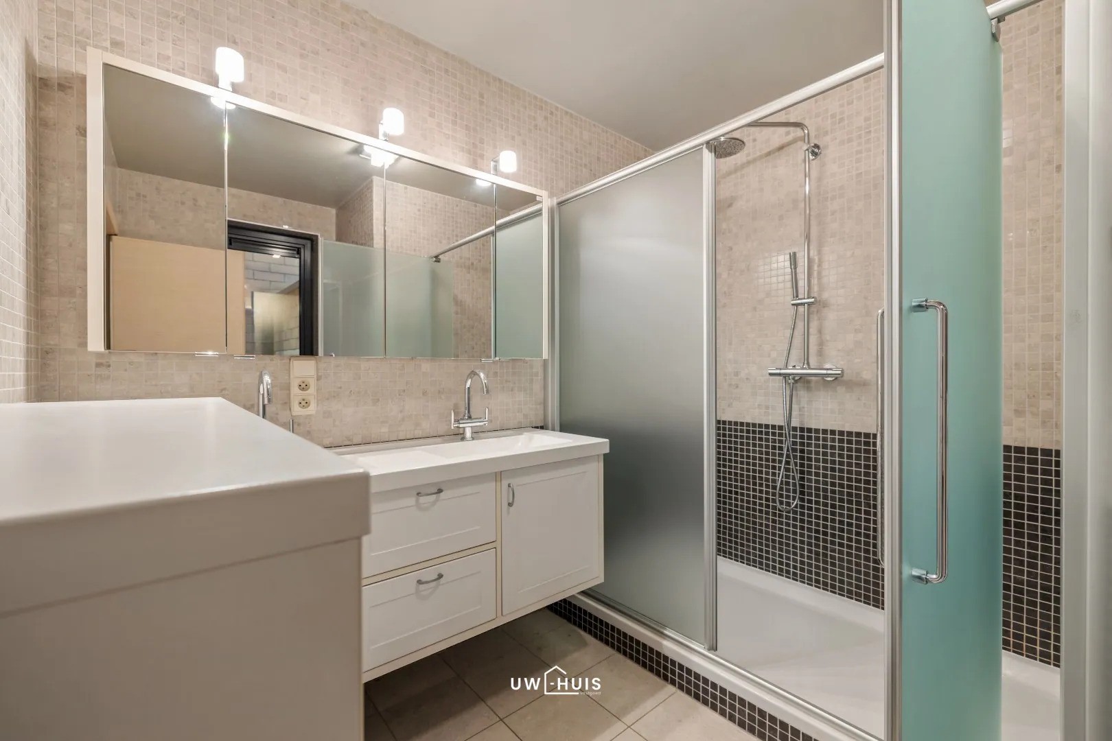 Achteraan is er een ruime slaapkamer met ensuite badkamer die is voorzien van dubbele lavabo en grote douche.