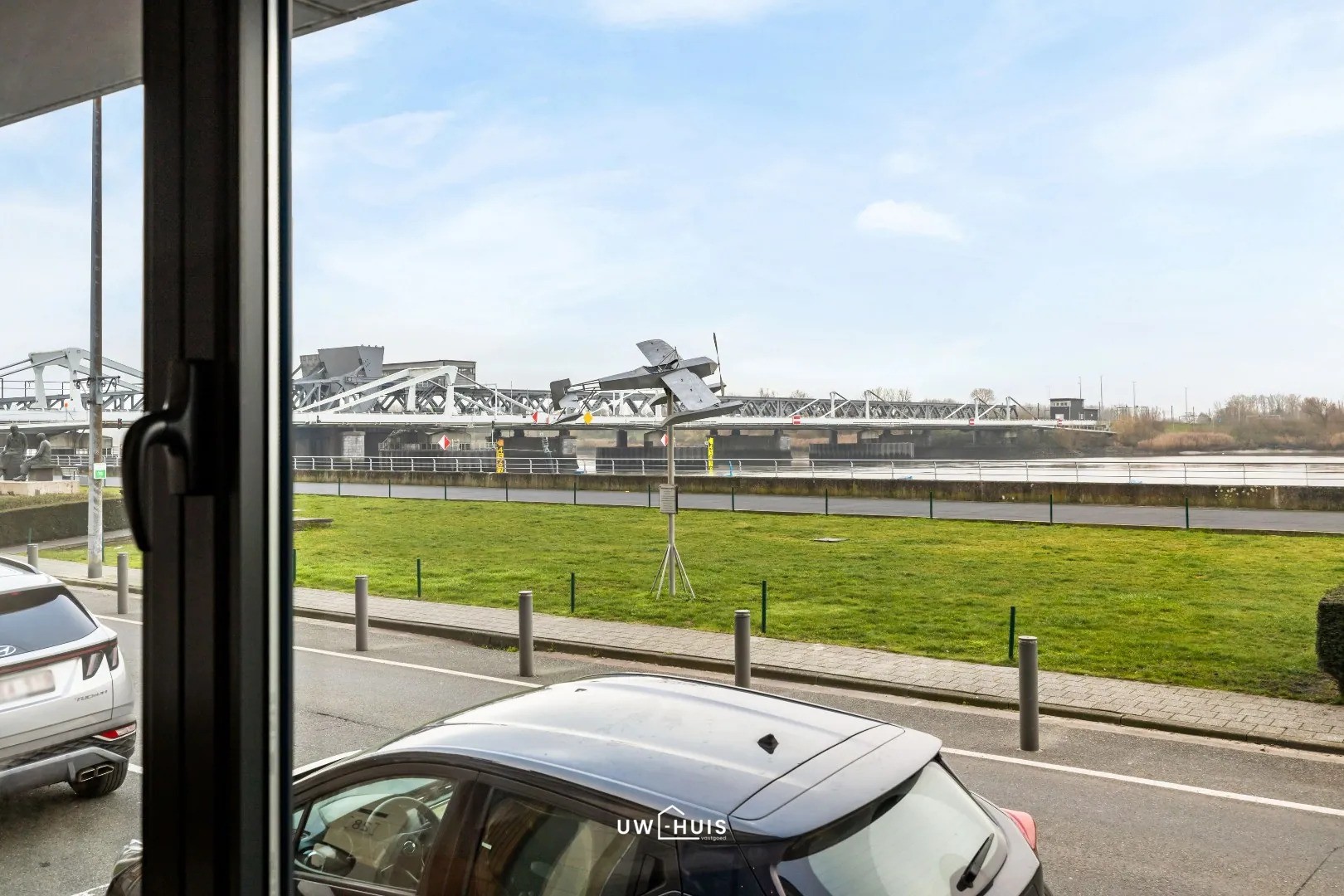 We komen binnen in de open leefruimte die een fenomenaal zicht heeft op De Schelde. De keuken beschikt over een granieten werkblad, dubbele spoelbak, kookplaat, oven, ijskat en dampkap. In de hal is er een vestiaire, een aparte berging met aansluitingen en een apart hangtoilet.